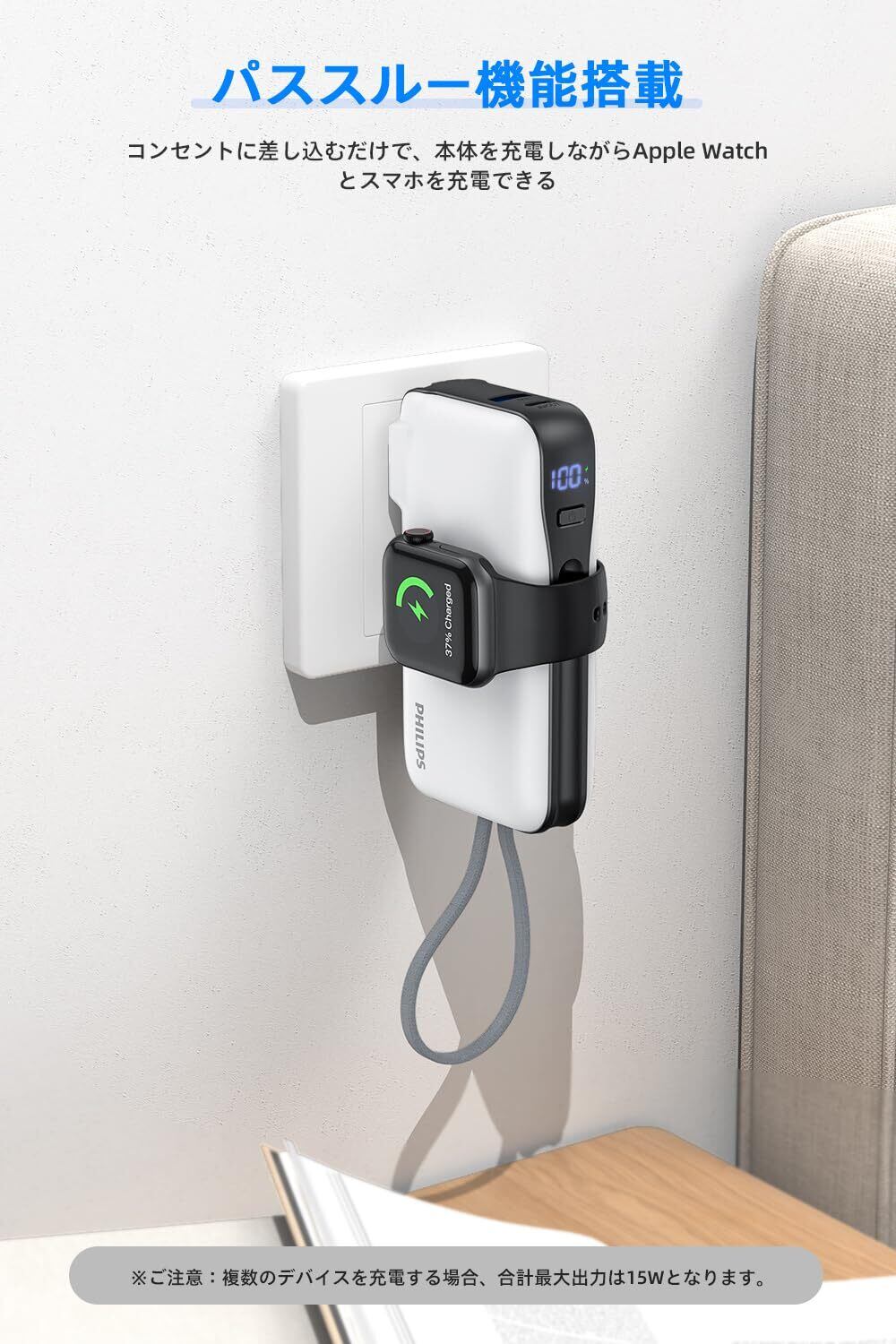 【1台4役の旅行用多機能モバイルバッテリー】 Apple Watch充電パッド、モバイルバッテリー、充電器、USB-Cケーブルが一体型になり、旅行なら、この一台があれば心強いです。折畳み式のACプラグを装備し、開いた状態ではコンセントに差し込んで充電器として使用でき、収納すれば携帯充電器として使用できます。イギリス、ヨーロッパ、オーストラリアの電源変換プラグも付属しており、海外でも安心して充電できます。※本製品には省電力モードが搭載されています。Apple Watchを充電する前に、電源ボタンを押してバッテリーをウェイクアップさせてから、Apple Watchを載せて充電を開始します。