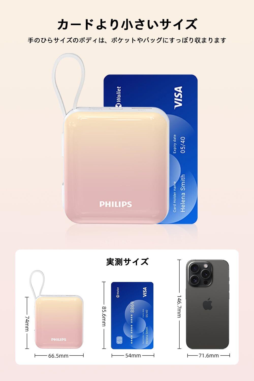 【カードサイズで携帯便利】 PHILIPS 超小型モバイルバッテリー新登場!6.65cmx2.55cmx7.4cmのミニボディ、手のひらサイズでポケットやカバンにもすっぽり収まります。 重さはわずか176gで、手に持っても負担になりません。歩きながら充電する必要がある方には、間違いなくおすすめのアイテムです。