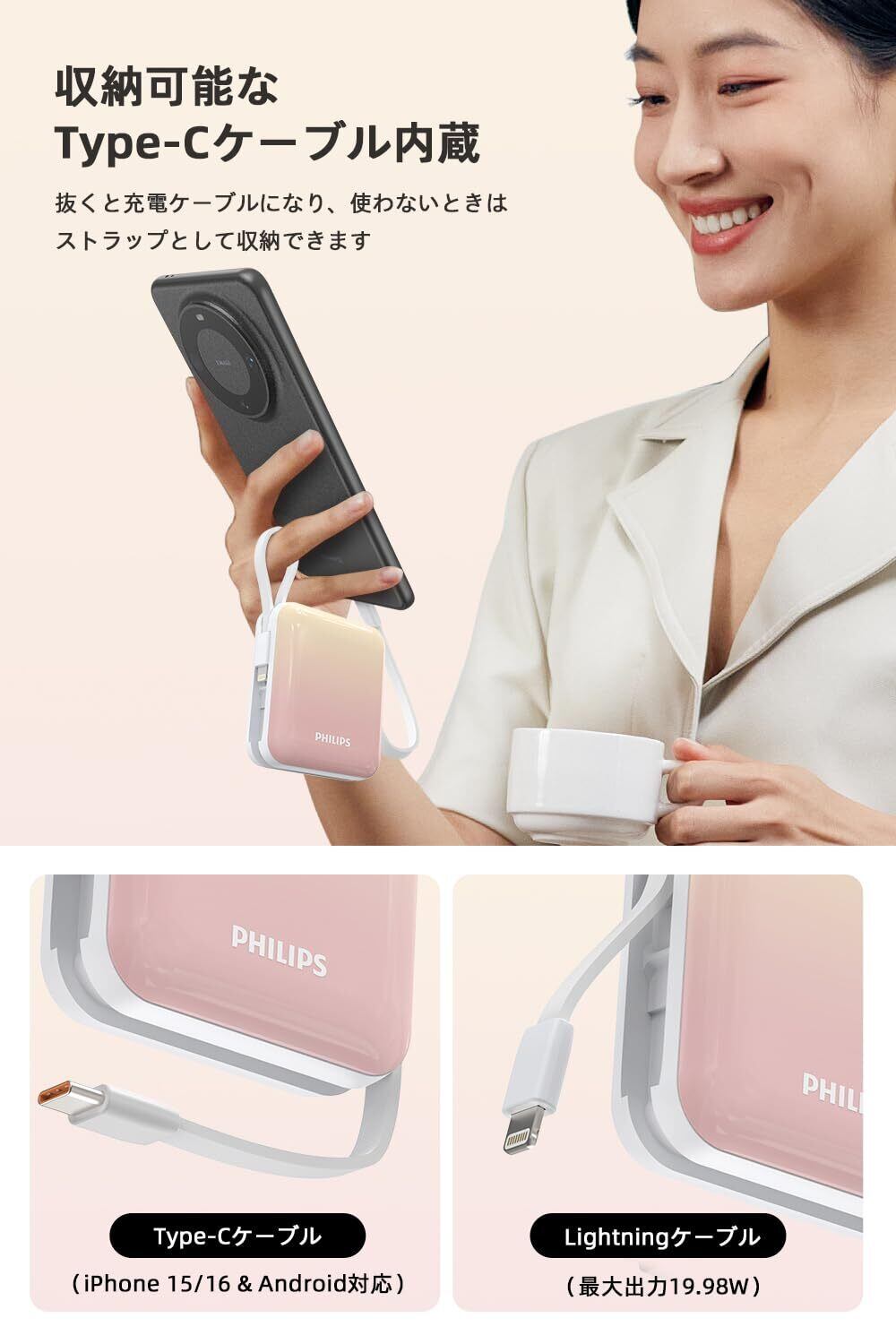 Philips (フィリップス) モバイルバッテリー 10000mAh 大容量 小型 携帯充電器 Lightning type-c ケーブル内蔵 22.5W 急速充電 タイプc ライトニング 4台同時充電 スマホ 充電器 持ち運び iPhone 16 / 15 Android iPad 各種機器対応 PSE認証済 (ピンク黄)