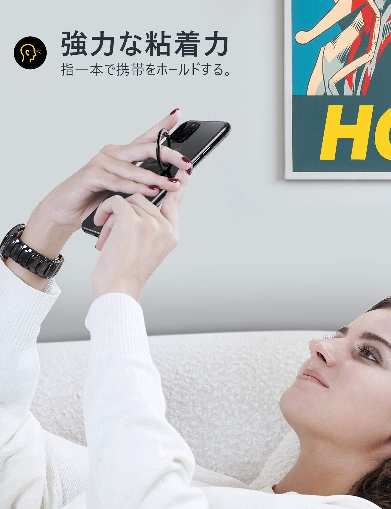 【落下防止・片手操作】リングに指を通して持つことで落下防止に役立つ。また、画面に触れる範囲が広くなり、片手操作が楽になります。
