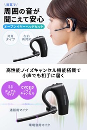 【数量限定】サンワダイレクト Bluetoothヘッドセット 片耳 オープンイヤー デュアルマイク付き ノイズキャンセルマイク 両耳対応 マルチポイント対応 USB-C充電 片耳イヤホン ハンズフリー ワイヤレス 400-BTMH027BK