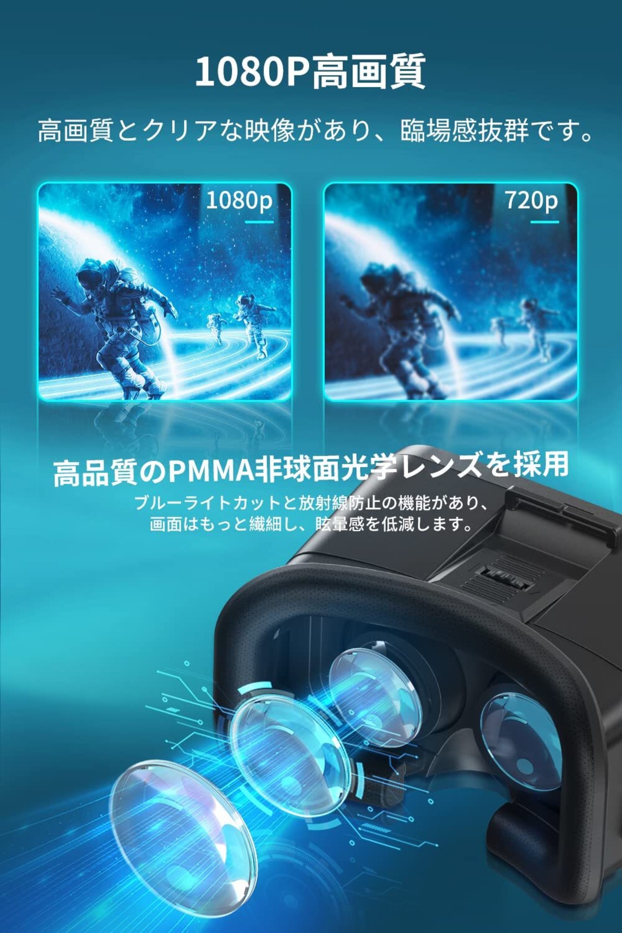 【PMMA非球面光学レンズ】本vrゴーグルは、高品質のPMMA非球面光学レンズを搭載し、ブルーライトカットと放射線防止の機能があります、画質の鮮明さを向上させると同時に画面歪みの状況を効果的に低減します。同時、画面はもっと繊細し、目眩を低減します、目に与える疲労感も軽減できます。最大限で人物や他のシーンなどのモザイク化を押さえ、はっきりとしたビデオや映画などを見えます。