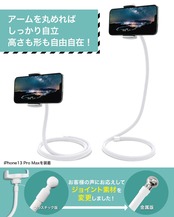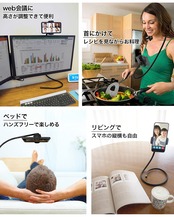 【フレキシブルなスマホホルダー】長さ94㎝のシリコンチューブを自由に曲げられます。アームを丸めればしっかり自立。高さも形も自由自在!立てて、伸ばして、はさんで、引っかけて、巻きつけて…使い方は自由自在。平らな台やクリップをはさめるところが無くても、ハンズフリーでスマホ視聴や撮影が楽しめます。