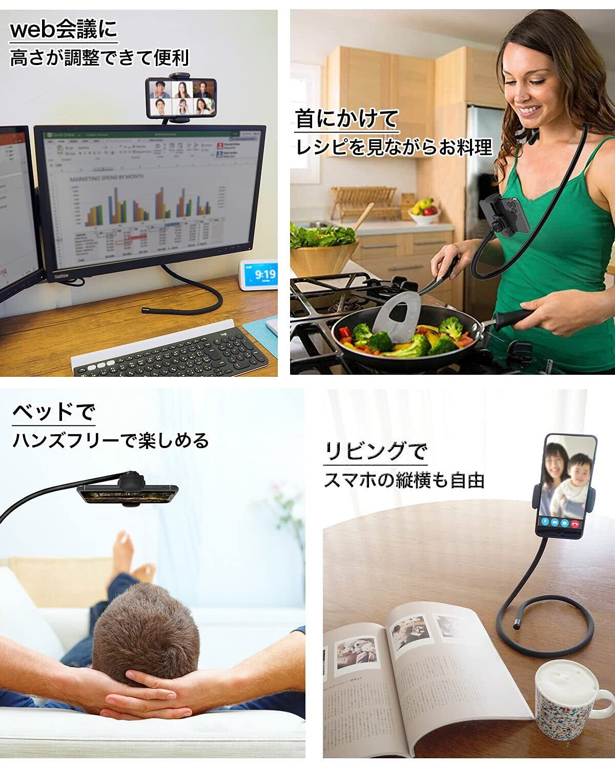 【例えばこんな使い方も】枕やマットレスの下に差し込んで、またはパイプベッドに巻き付けて、寝ながら動画視聴。屋外で、丸い石の上に置いたり手すりに巻き付けたりして写真撮影。首に引っ掛けてレシピを見ながら料理。車のヘッドレストやベビーカーにつければお子様もニッコリ。自転車のハンドルに巻き付ければスマホがナビ代わりに。まっすぐ伸ばして長めの自撮り棒に。もちろん、机やテーブルに置いてWEB会議やビデオ通話に使っても、高さが自由に変えられるからとても便利です。