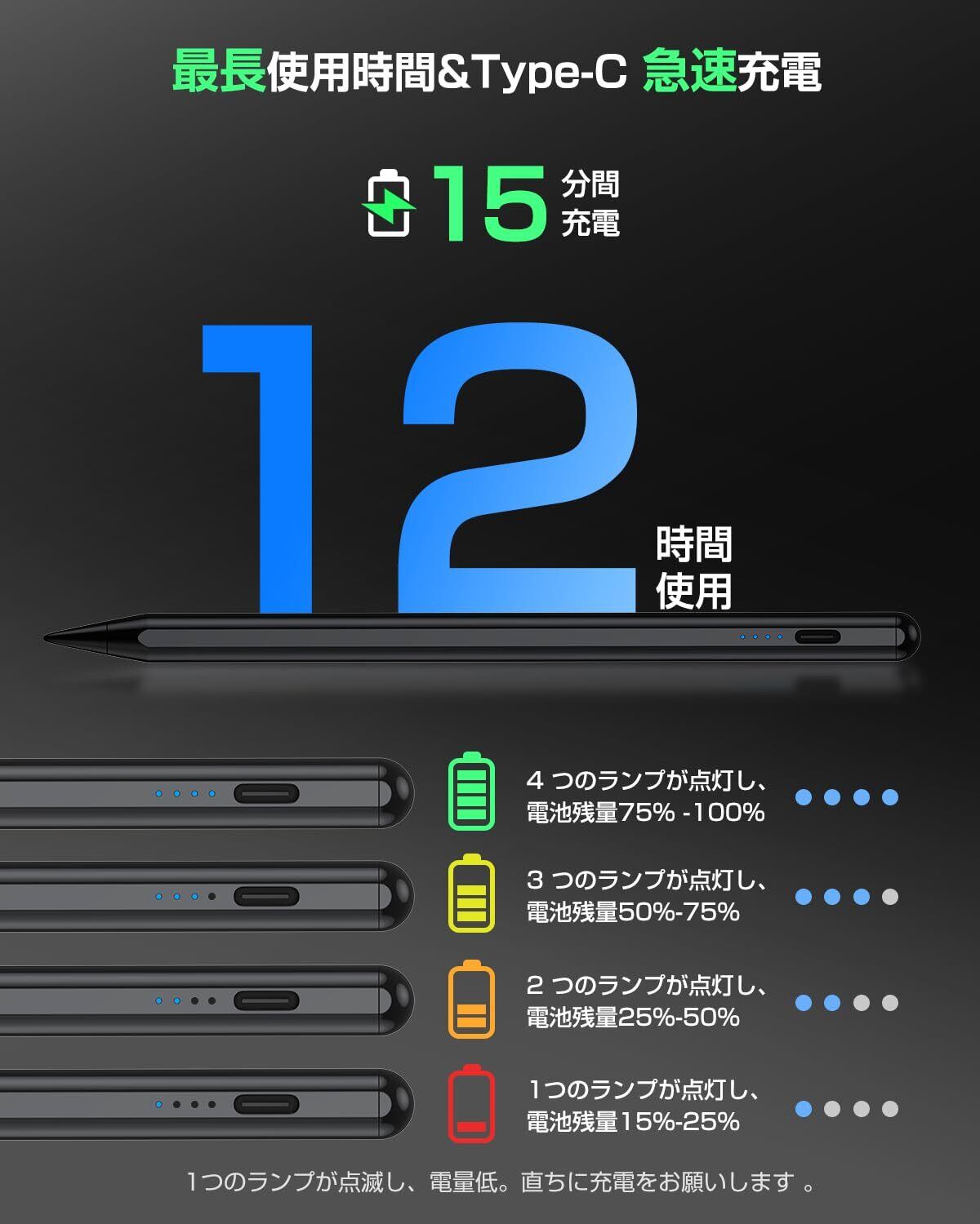 【Type-C超高速充電 & 進化した長時間使用】KINGONE iPad用 ペンは、充電1分で50分、充電4分で2時間使用できます。30分間フル充電でき、12時間連続使用可能、いつでもどこでも取り出して使うことができます。高速充電とバッテリー寿命を楽しんでください、バッテリー切れの心配はありません!(付属品:スタイラスペン×1、日本語説明書×1、替チップ×3、USB変換タイプc充電ケーブル×1)