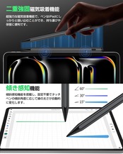 【二重磁気吸着構造 & 使いやすさ】KINGONE iPad用ペンシルは、二重強固磁気吸着機構を採用し、いつでもどこでも安全に使用できます。ノートを取ったり、スケッチのアイデアを練ったりする際に、紛失や置き忘れを心配することなく、便利且つ迅速に作業を行えます。ペアリング不要のスマホスタイラスペンで、Bluetoothフリーなしで簡単に操作でき、スイッチを軽く2回タッチするとON/OFFができます。 4つのLEDを搭載し、バッテリー残量が一目で確認できます。 超軽量13.5gなので、長時間の作業でも手が疲れません。 ※ご注意:磁気吸着機能対応: iPad Pro 12.9"、iPad Pro 11"、iPad Air 第4/5世代、iPad mini第6世代。磁気吸着機能非対応: iPad Pro 13/11 inch(M4)、iPad Air 13/11 inch(M2)、iPad第6/7/8/9/10世代、iPad Air第3世代、iPad Mini第5世代。