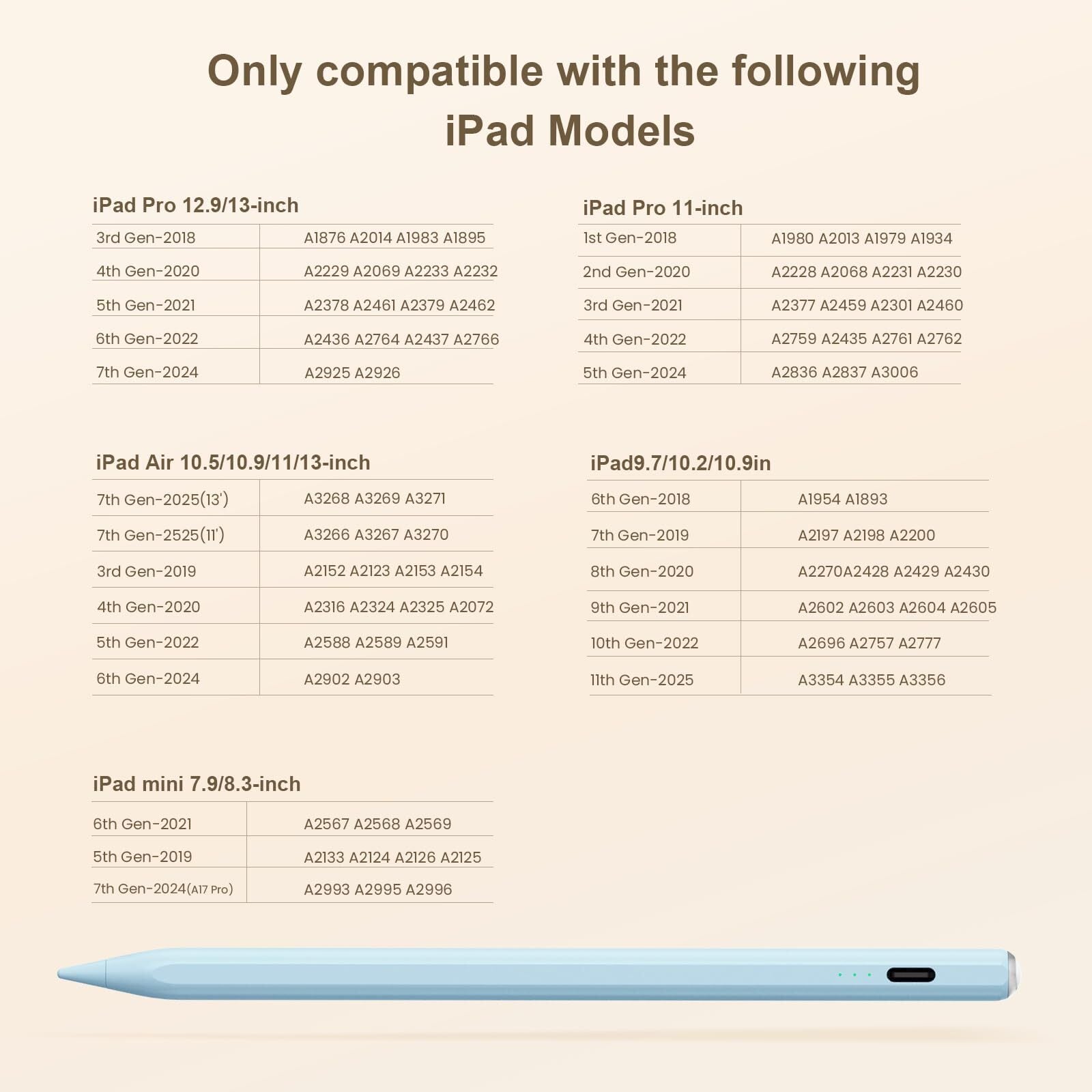 【幅広い互換性】: スタイラスペンはiPad 2018-2025シリーズに対応:iPad 第11世代 11インチ 2025/10/9/8/7/6世代、iPad Air 7th 11インチ (M3) 2025/7th 13インチ (M3) 2025/6/5/4/3世代。 iPad Pro 333。 .0 インチ M4、iPad Pro 12.9インチ 3/4/5/6世代、iPad Pro 11インチ 1/2/3/4th/M4、iPad Mini 7th (A17 Pro)/6/5th Gen。注意: この鉛筆は、2018年以前のiPadモデル、iPhone、Android、Microsoftデバイスには対応していません。 ご注文の前に製品モデルをご確認ください。