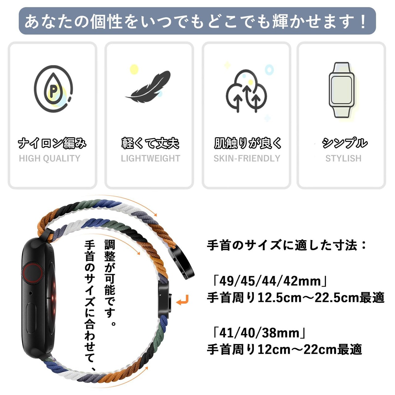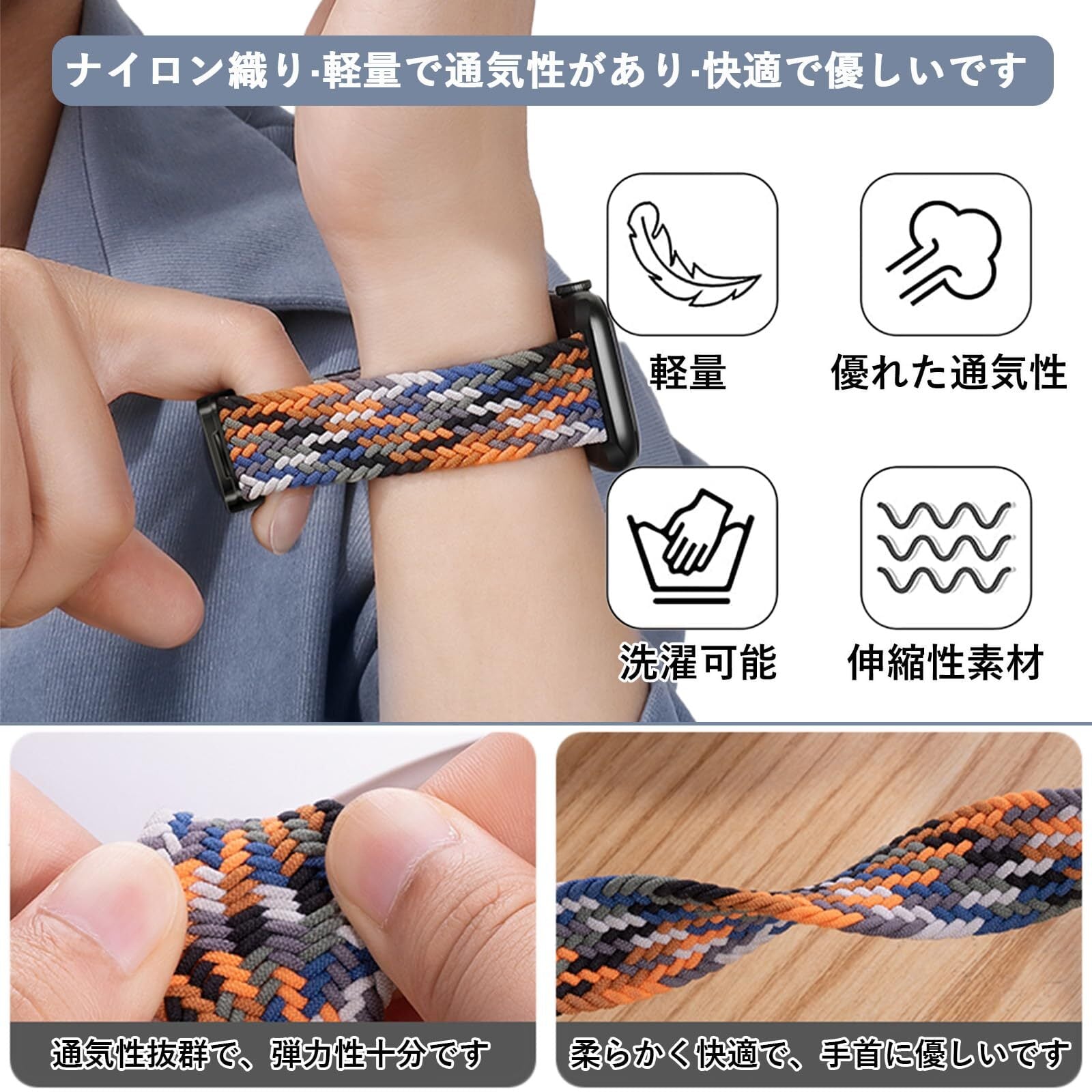 【軽やかな通気性】このナイロン製のWatchバンドは通気性に優れており、肌にやさしくフィットします。暑い季節でも快適に使用でき、手首が蒸れることなく、サラッとした着け心地を提供します。四季折々の気候にも対応し、いつでも爽やかにお使いいただけます。