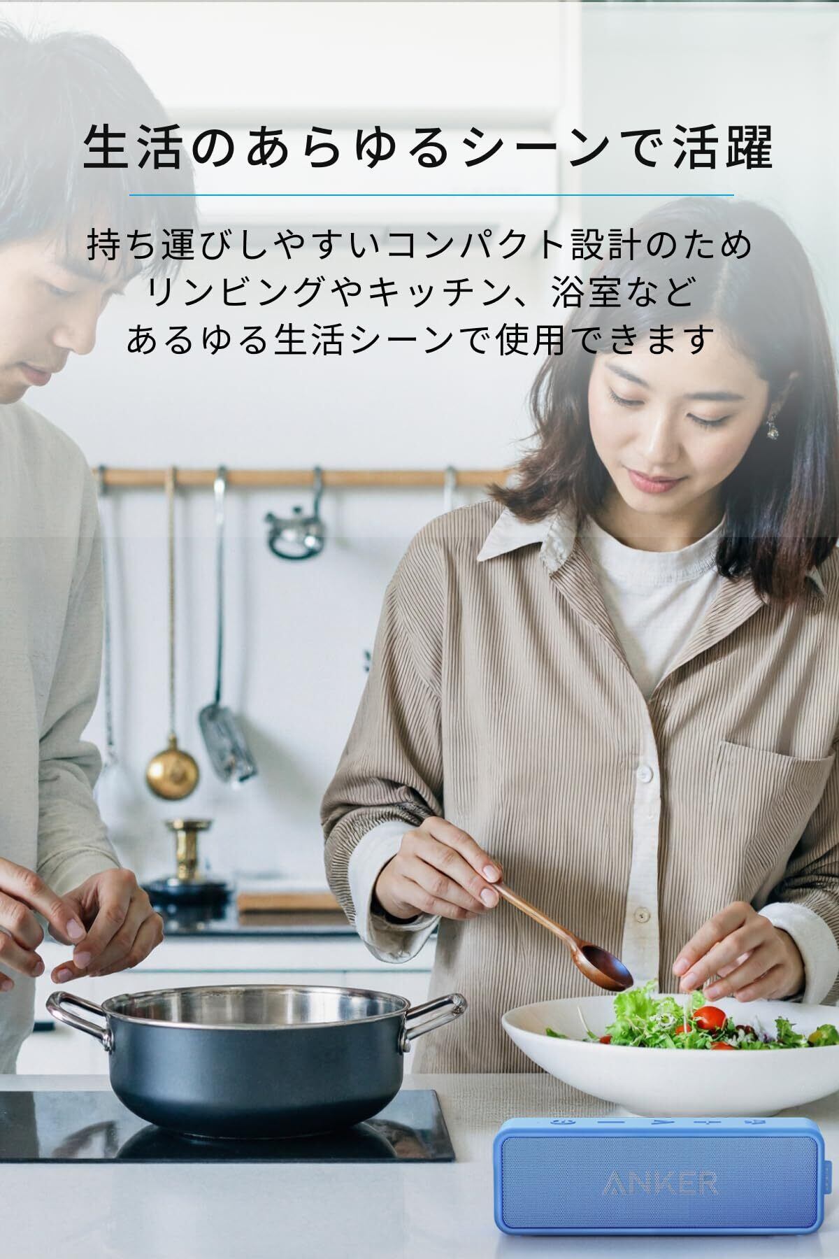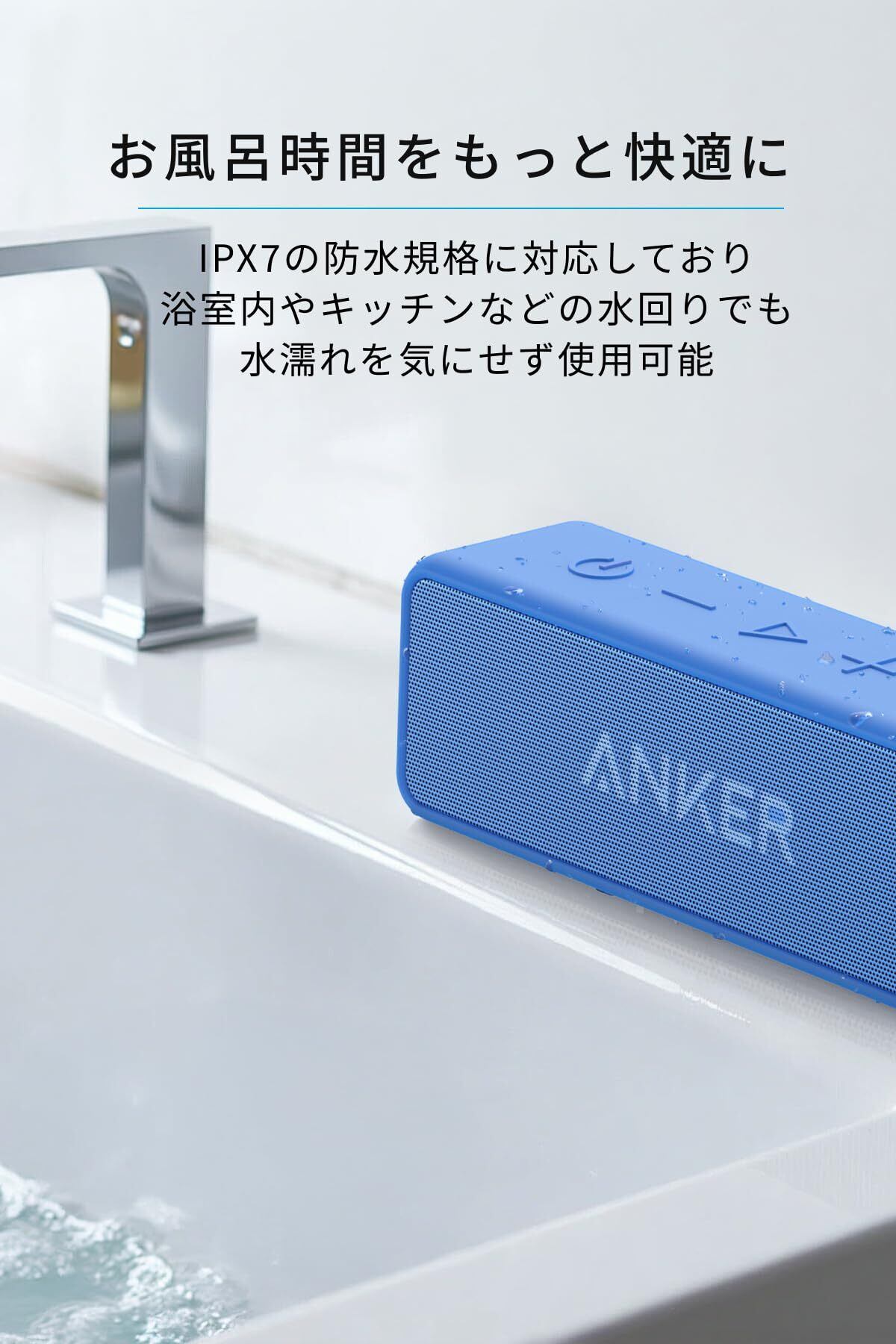 IPX7の防水規格:IPX7の防水規格対応なので、浴室内やキッチンなどの水回りでも水濡れを心配することなく音楽を楽しむことができます。