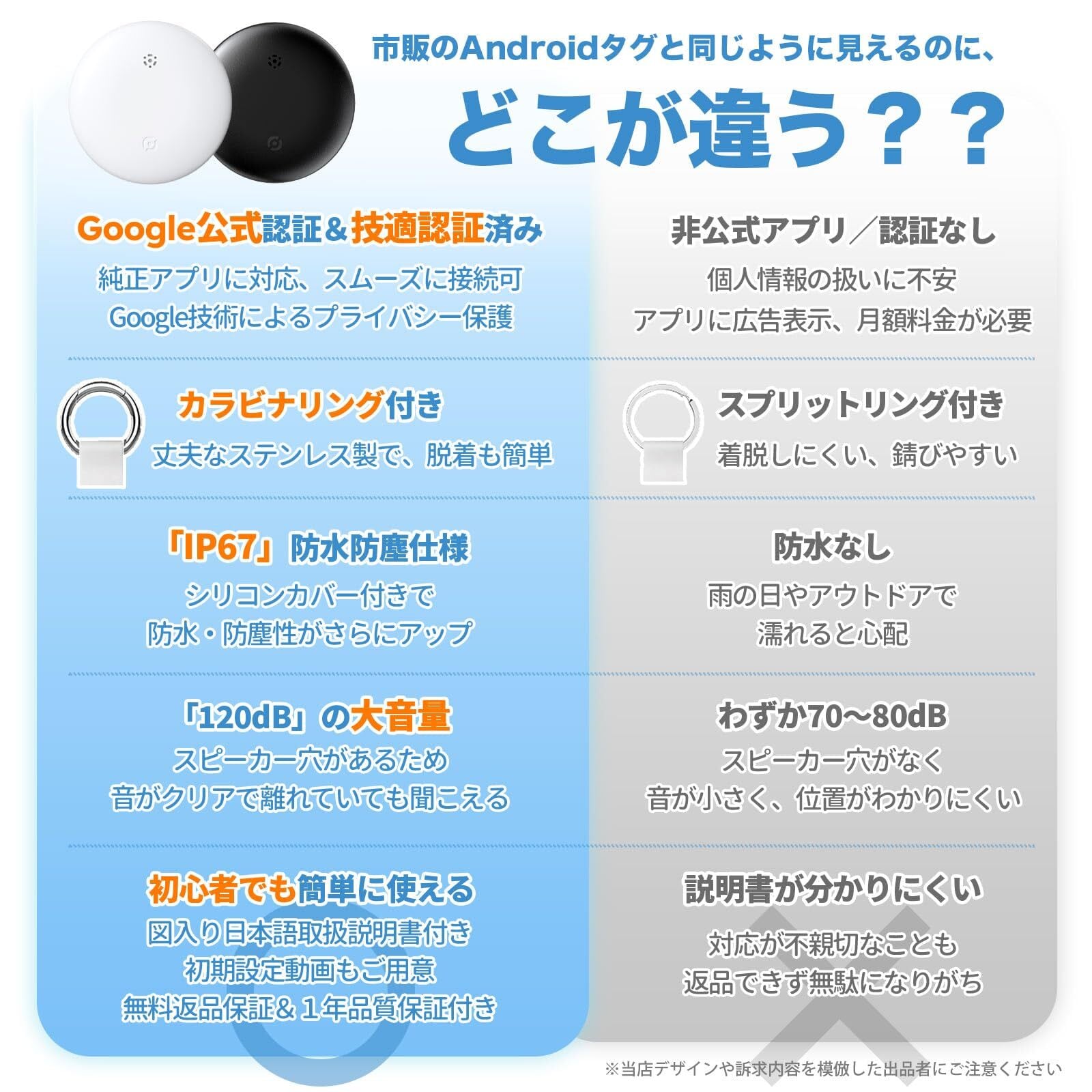 【純正アプリ対応のAndroidエアタグが登場!】純正アプリだから安心!アンドロイドと完全連携し、スムーズな接続、高精度な追跡と信頼のプライバシー保護を実現!!【キーホルダー付属】カバンやベルトに簡単に取り付けられ、子供や高齢者の持ち物の紛失防止タグとして最適!【最新改良!120dBの大音量】従来品(70〜80dB)では、バッグの中やソファの隙間などに紛れた場合、音が聞こえづらく見つけにくいことがありました。本製品は大音量の120dBにアップグレードし、離れた場所でもしっかり音が届いて、すぐに見つけることができます。【防水強化!】IP67防水仕様+防水カバー付き。雨や水しぶきにも強く、普段使いやアウトドアに大活躍!