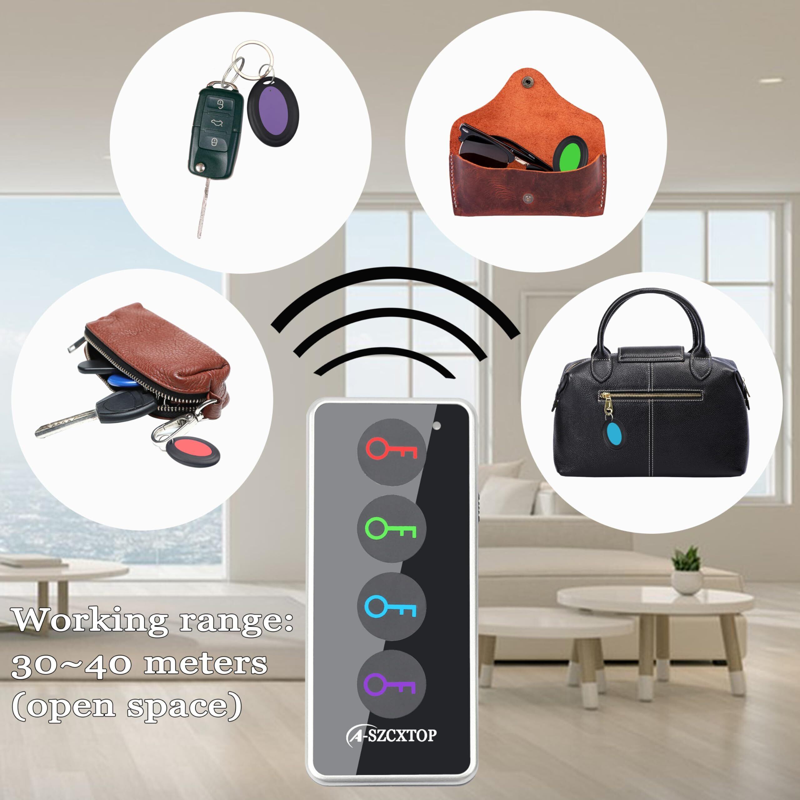 【音付きキーファインダー4個】- 失くし物が見つかりませんか?A-SZCXTOPのキーファインダーロケーターをお選びください。ボタンを押してビープ音に従うだけ!もう貴重品を失くすことはありません。受信機4個、キーホルダーリング、両面テープが付属しており、鍵、テレビのリモコン、携帯電話、財布、ペット(猫のトラッカー)、荷物など、紛失しやすい貴重品に貼り付けることができます。