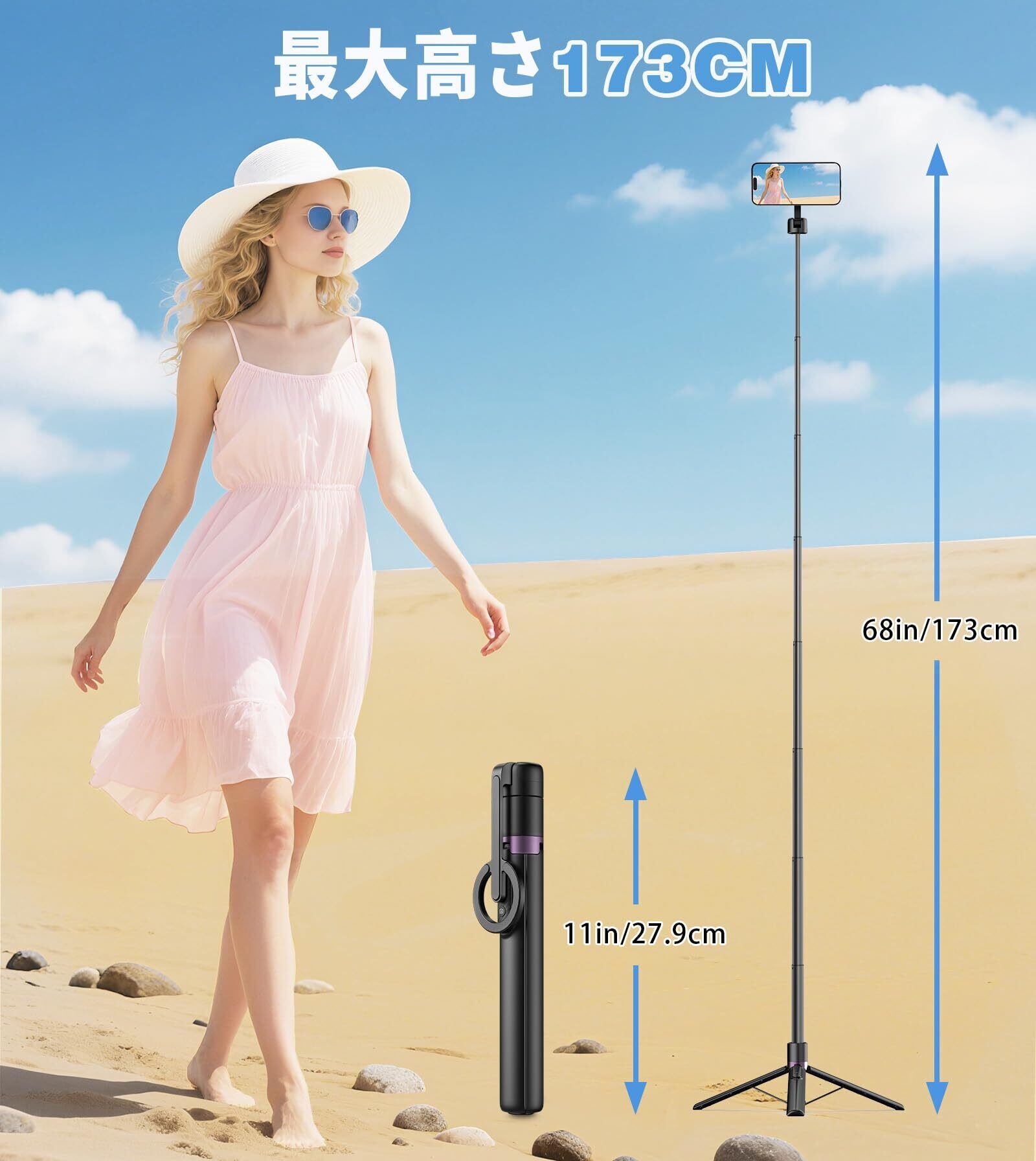 8段階伸縮&角度調整可能:磁気 三脚は8段階伸縮可能で、高さ27.5cmから173cmまで簡単に調節できます。ワンタッチ設計で、3脚の底部ボタンを押すだけで伸縮ロッドがスムーズに引き出せます。垂直方向に合計200°の範囲内で角度調整が可能ですだけでなく、 縦横モードの切り替えがスムーズで、360°回転も可能で、さまざまな撮影角度に柔軟に対応します。これまでのスマホホルダーよりさらに角度調整が自由自在になりました。