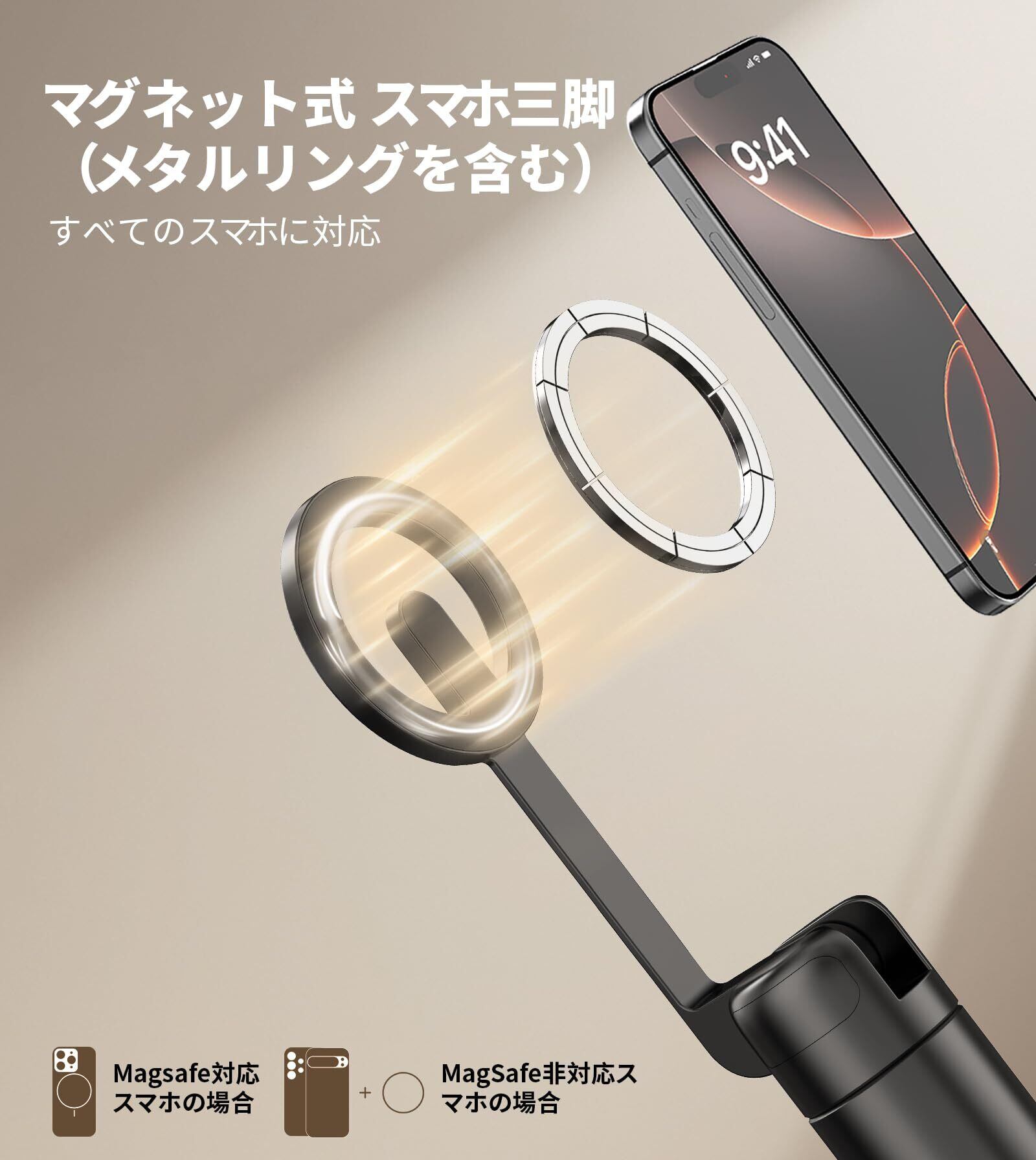 Magnetic スマホ三脚:自撮り棒 三脚は磁気吸着設計を採用しており、クリップを使わずに磁気対応(iPhone 12/13/14/15/16シリーズ)のスマホを簡単に固定できます。強力な磁力により、スマホがしっかりと吸着し、落下の心配も少なくなります。磁気非対応のスマホには、付属のメタルリングをスマホの背面に貼り付けるだけです。磁気式スマホ固定リングの最大耐荷重は500gで、より重いデバイスにも対応可能。