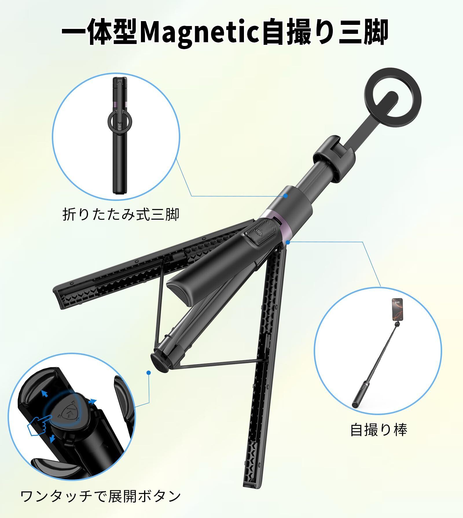 取り外し可能なリモコン&操作簡単:最大通信距離10m(スマホにのみ接続可能)、「CX609」を検索してスマホにすばやく接続でき、両手を解放しながら遠距離から写真/動画を撮影することができます。また、強力なマグネットを搭載したMagnetic 自撮り棒は、両手で操作する必要もなく、片手で軽く触れるだけでわずか0.1秒でスマホが自動的に吸着します。