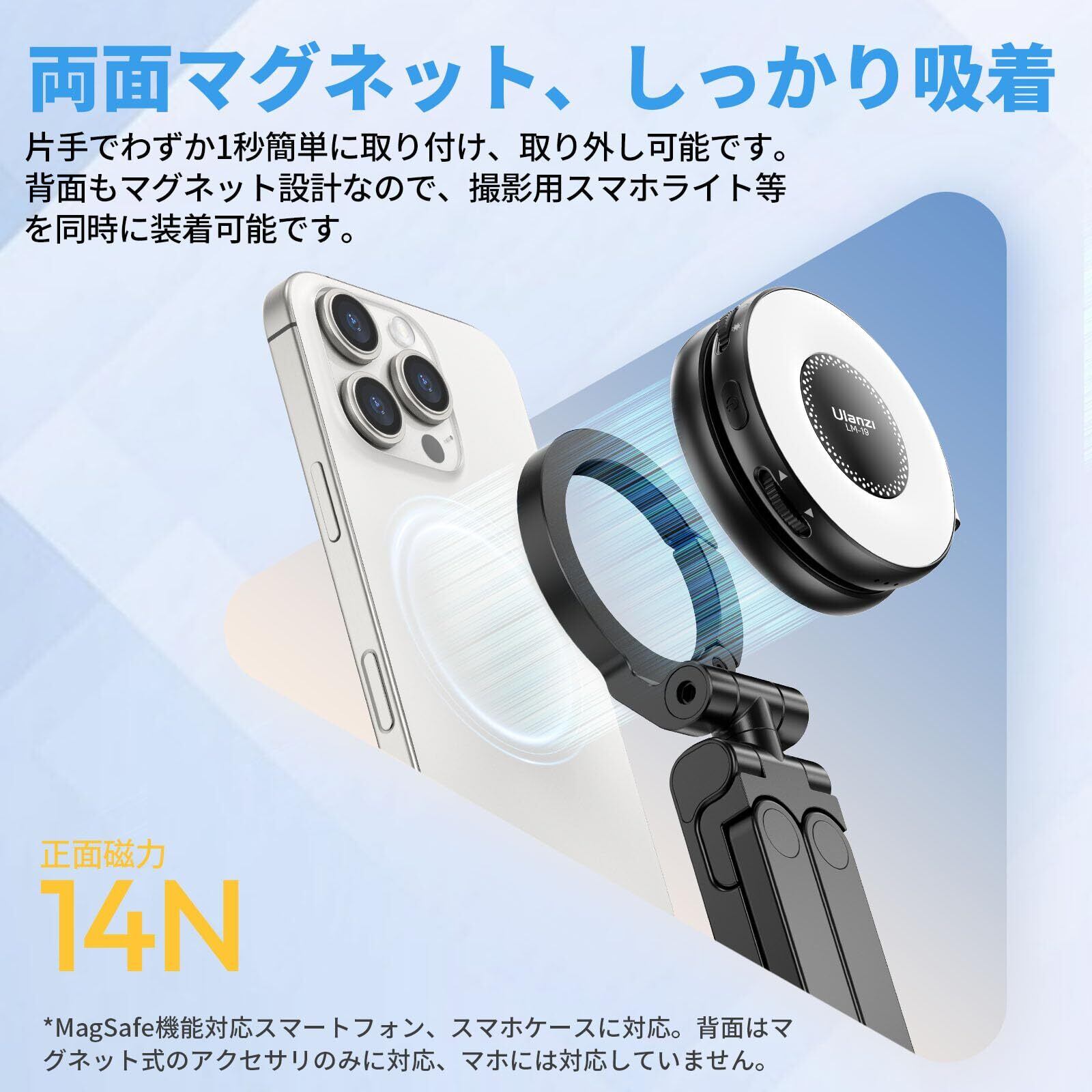 【超強力両面磁気・安定感抜群】Ulanzi MA88 三脚はMagSafe用スマホホルダーは超強力磁力の磁石を使用して、超強力磁気で、簡単に脱着しません、安定で安心に使用いただけます。片手でわずか0.1秒簡単に取付可能です。また、裏面にも磁気があり、LEDライト、スマホレンズフィルターキットなどのアクセサリーを吸着ことができます。ご注意:スマートフォン用ケースを装着している場合、製品の吸着に影響します。携帯電話ケースと併用する場合は、MagSafe対応のケースを使用する必要があります。