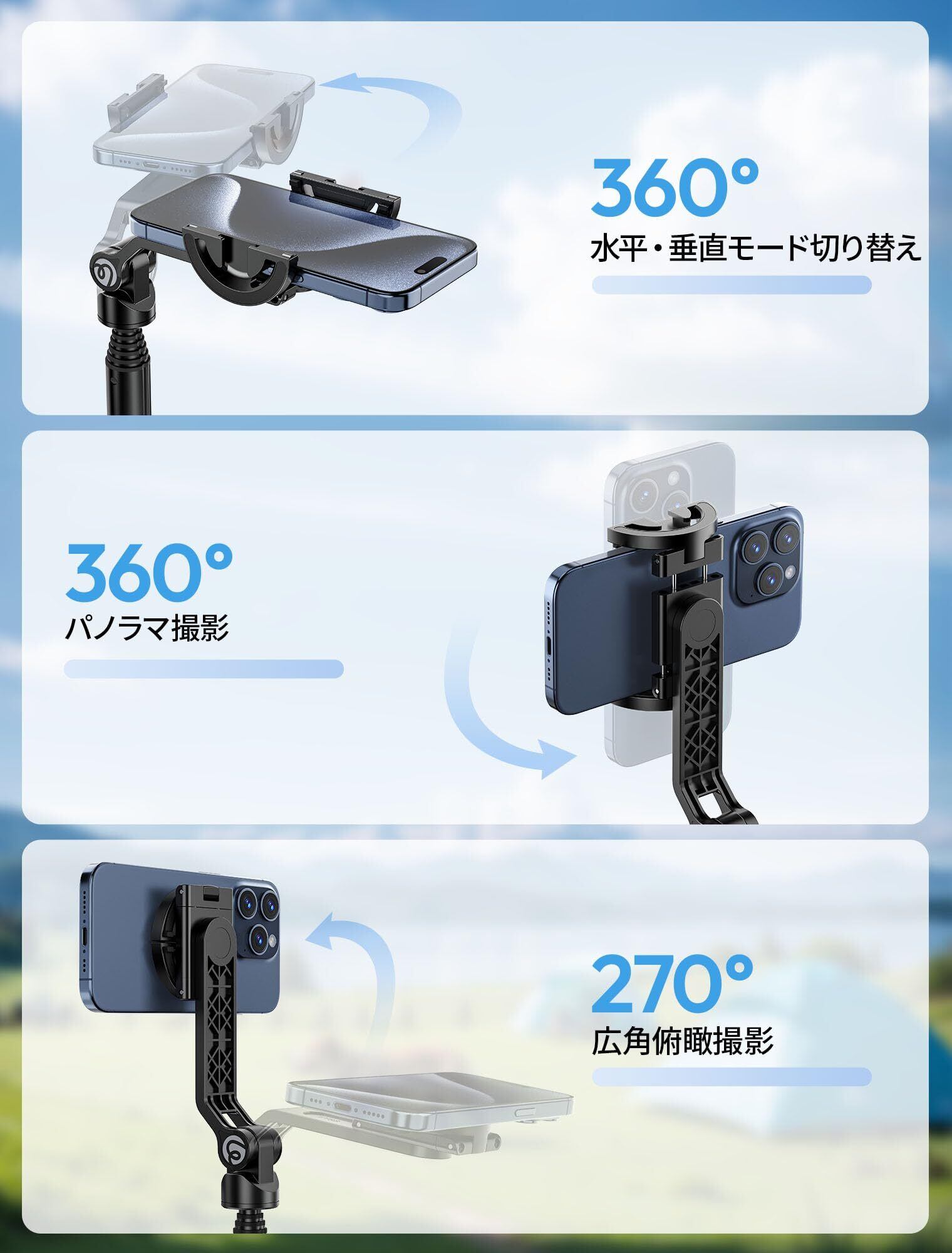 【コンパクトで軽量、持ち運びに便利なデザイン】折りたたむスマホ三脚は7段階伸縮可能で、高さ30cmから144cmまで簡単に調節できます。2in1マホ三脚は上下270°調節でき、360°回転でき、360°パノラマ撮影自撮り、俯瞰撮影が可能、全域の多角度調整確保します。お好みの角度に調節と姿勢を探し、自由自在に撮影できます。