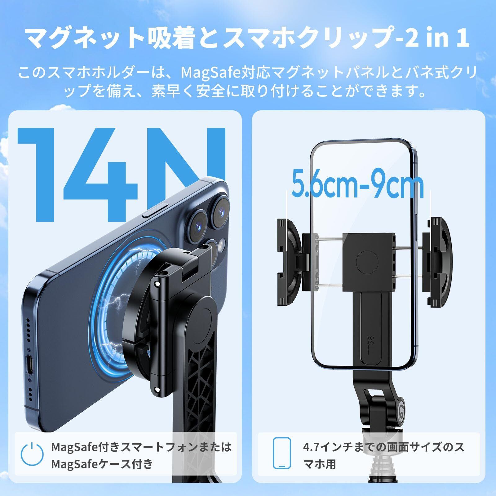 【2025年2in1自撮り棒】 MagSafe用自撮り棒ではスマホを固定する部分が強力マグネットへ進化しスマホをしっかり吸着固定した。マグネットリングが変形してコールドシュー付のスマホクリップになります。スマホクリップは拡張して、クリップ距離が5.6~9cmの通常のスマホに変換することもでき、ほとんどのスマホに適しています。iPhone/Android対応。三脚/自撮り棒を一体化されたデザインで、セルフィーと集合写真に加え、スマホ三脚スタンドも装備、生放送、動画鑑賞、ビデオ通話、オンライン会議などにも適用です。片手でわずか0.1秒簡単に取付可能です。