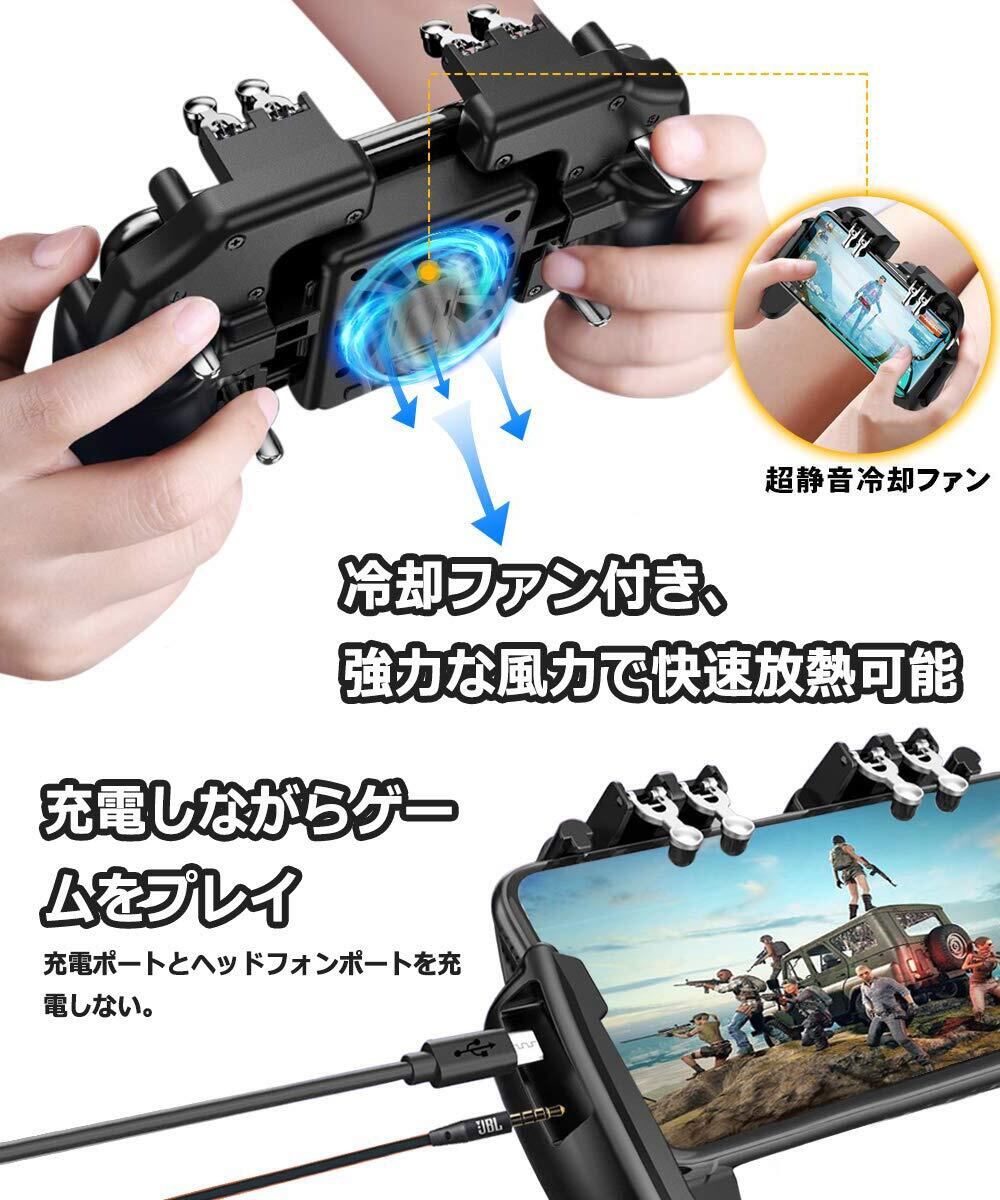 【人気の最新6本指操作】本製品は射撃ボタン、ゲームパッド、スマホ冷却ファンとスタンド4つの役割を一体化のファン内蔵ゲームコントローラーです。大人気スマホゲーム「PUBGモバイル」「荒野行動」「フォートナイト」がより楽しめるスマホ用ゲームコントローラー。バネ式で簡単に取り付け可能、射撃、照準、ジャンプ、伏せる、移動、歩行転換がスムーズにでき6本指同時操作可能、操作ボタンを様々なアクションに組み合わせて、勝率アップも目指せます。