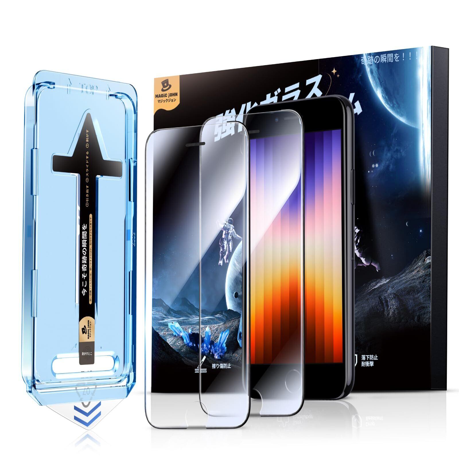 【人気商品】【光沢】MAGIC JOHN 対応 iPhone SE3/SE2/8/7/6 用 ガラスフィルム 2枚セット ガイド枠一体式 貼りやすい 高透過率 触り心地良い