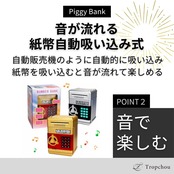 【音が流れる紙幣自動吸い込み式】 紙幣投入口で紙幣を検出すると自動販売機のように自動的に吸い込みます。紙幣を吸い込むと音が流れるので、楽しみながら貯金ができます。