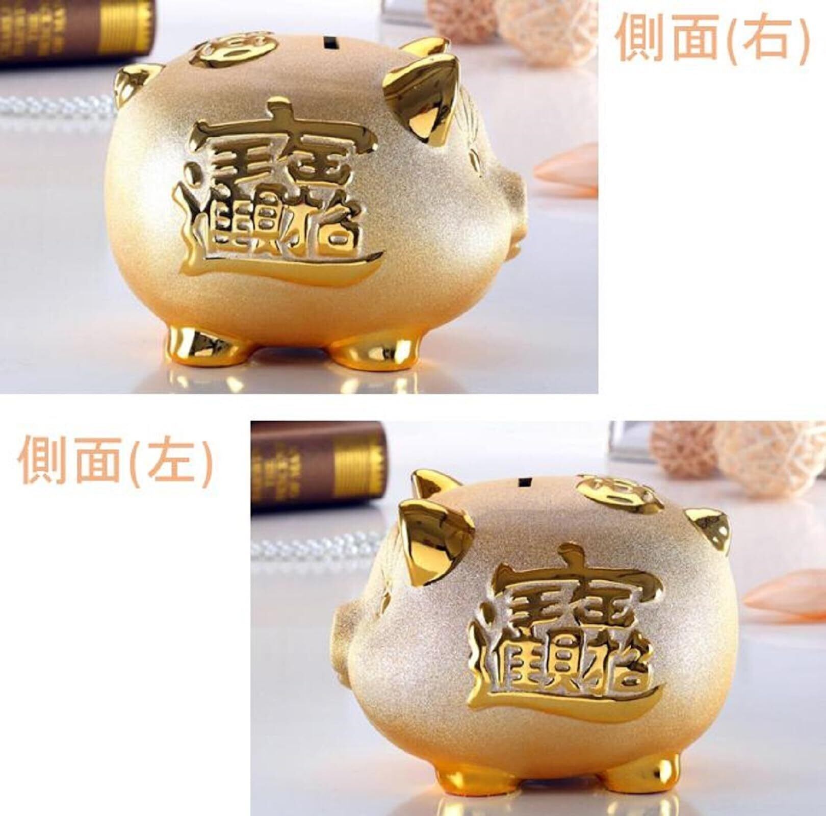 【商品説明】金運アップや開運を願う方におすすめの、金色のブタ型貯金箱です。風水ではブタは富や繁栄の象徴とされ、金色の輝きがさらに運気を引き寄せます。デスクや棚に飾るだけで、空間に華やかさと幸運をもたらします。底部のキャップを外せば、簡単に貯めたお金を取り出すことができ、小銭だけでなくお札も収納可能です。新年の飾りやお祝いのギフトとしても最適なアイテムです。
