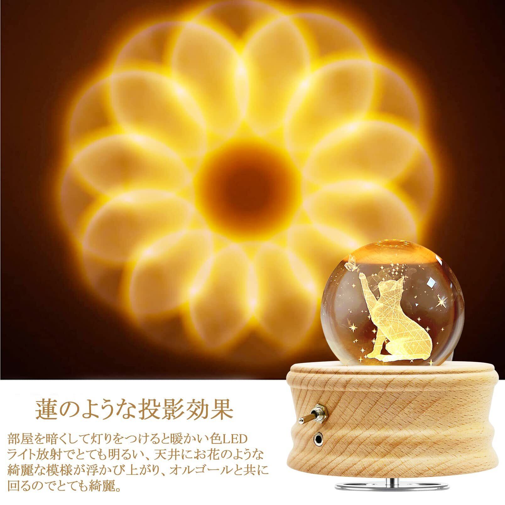 【癒しグッズ 猫オルゴール】幻想的なクリスタルボールと高級感のある木製土台で、上品なインテリアにもなるアイテムです。透明なクリスタルボールの中に3Dで表現された猫様と蝶が美しいオルゴールで、デスクに置いてふと眺めるも良し、部屋を暗くして灯りをつけると、天井にお花のような綺麗な模様が浮かび上がり、素朴なオルゴールの音色と共に回るのでとても綺麗で、癒されます。美しいギフボックスを包装して、子供、彼女、友達、家族など大切な人への誕生日・結婚記念日・クリスマス・卒業祝い・結婚祝いなどのシーンのギフトに大活躍です。