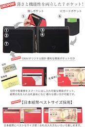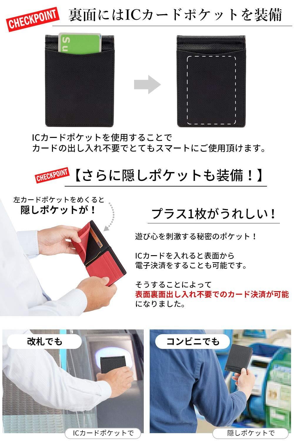 【 サイズ×素材 】サイズ:縦88mm、横115mm、厚さ10mm 日本紙幣ベストサイズ!海外製品には日本紙幣に対応していない規格もありますのでお気をつけ下さい。 素材:高品質PUレザー カードポケット部分はimitation microfiberを採用!カードの出し入れのしやすさを改善いたしました。 仕様:内側 カード入れ×4、簡易ポケット×1、隠しポケット×1 外側 ICカード入れ×1
