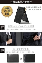 【本物のオイルレザー(牛本革)を贅沢に使用】外側・内側ともにオイルレザーを使用。本革ならではの優しい手触りと高級感があります。本革の特徴である「使うほど味と深みが出る」(エイジング)で、2年、3年とお使いいただくことでアナタだけのマネークリップができあがります。キズに強く、細かなひっかき傷も、通常のポケットの出し入れや手でこするなどの軽い摩擦でキズが徐々に目立たなくなります。クリップはゴールドとシルバー2本付属で、革の色にお好みの色合せでお使いいただけます(お届け時、ゴールドを本体にセットしています)。引き出しタイプのギフトボックスに入れてお送りしますので、大切な方へのプレゼントにも大変お喜びいただいております。