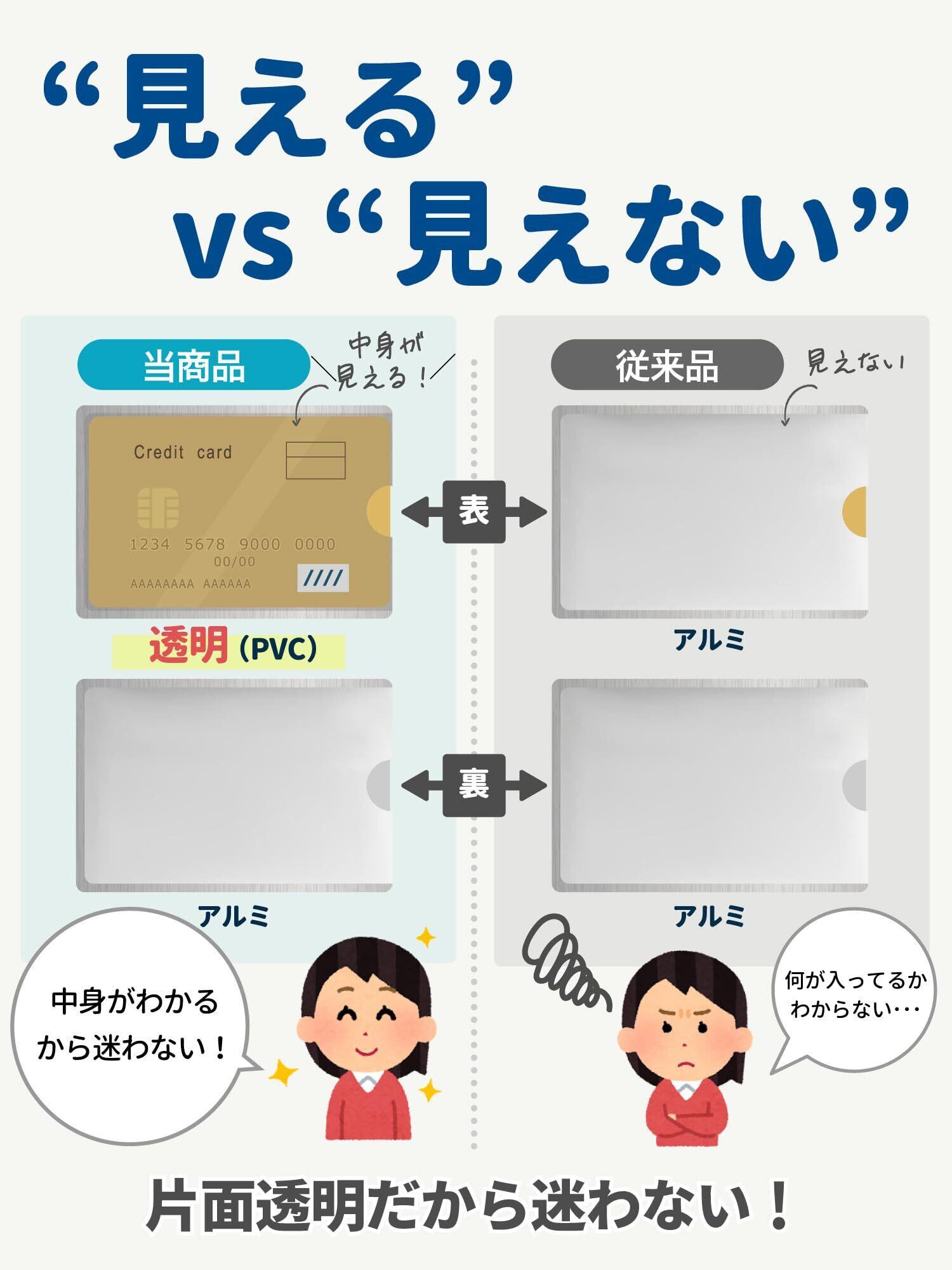 【中身が見えるスキミング防止カードケース】片面が透明PVCになったスキミング防止ケースなのでカード券面をひと目で判別することができます。改札やレジ前で “探す時間ゼロ” を実現します。