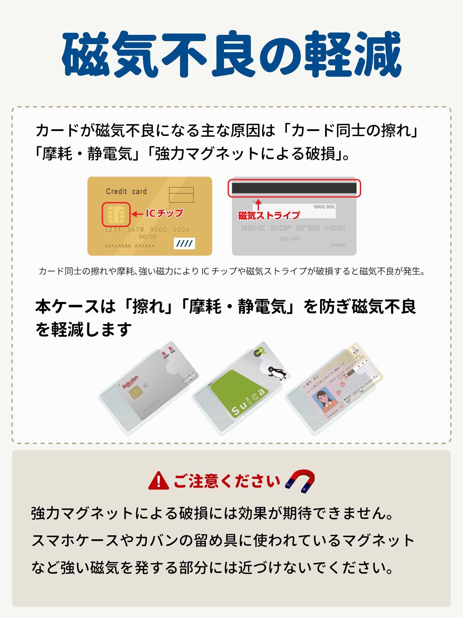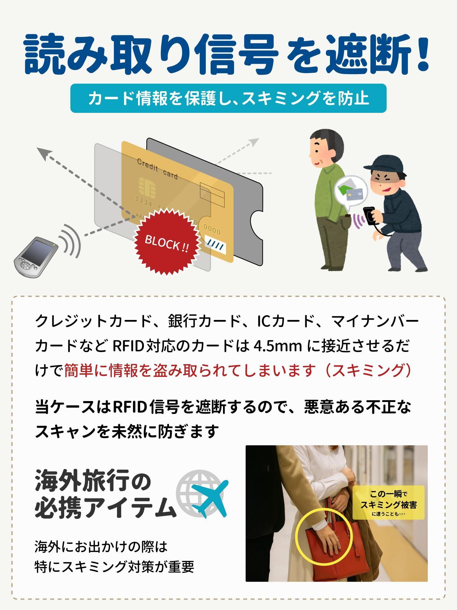 【RFID・磁気干渉をブロック】アルミ層が通信電波を遮蔽。悪意あるスキミングを未然に防ぐことができます。スキミング防止だけでなく、当ケースに入れることでカード同士の擦れ、摩擦、静電気を防ぎ磁気不良を軽減。クレジットカード・交通系IC・キャッシュカード・マイナンバーカード・運転免許証等を保護するケース。※環境により効果は変動