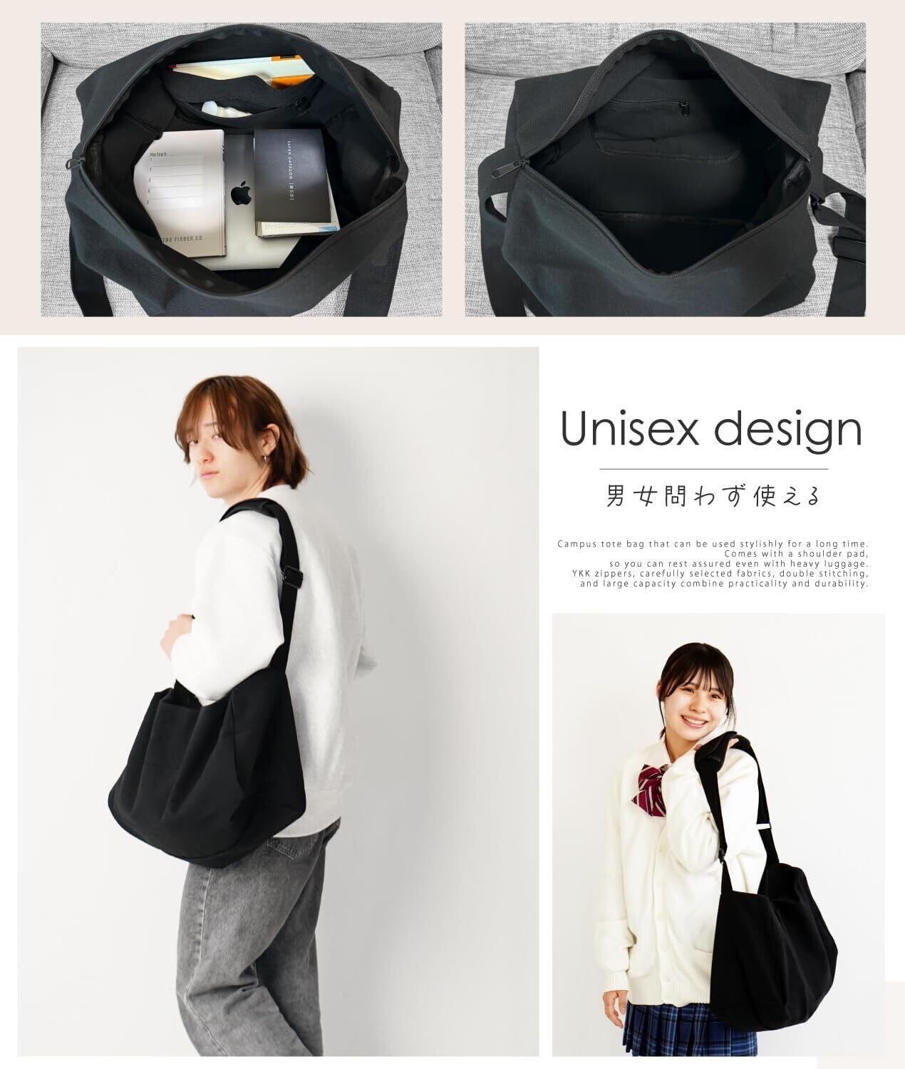 キャンバス 【徹底的にこだわった品質 】荷物が多くなりバッグが重くなっても安心「脱着可能ショルダーパッド」を付属。すぐ取りたい物を分けて収納できる「大容量内ポケット」に加え、安心の高耐久「YKKファスナー」を採用。また、強度面では安心の高強度「鉄製バックル」とショルダー付け根部への「二重縫製」で高強度を確保。 使い方のシーンにおいては、 スクールバッグ メッセンジャーバッグ エコバッグ 旅行バッグ ショルダーバッグ 、本製品1つでマルチに活躍します。