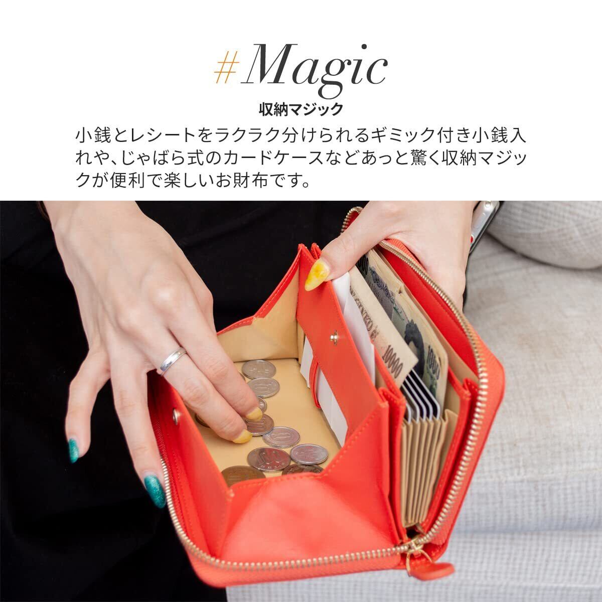 【あっと驚く収納マジック】整理上手なギャルソンタイプの長財布。じゃばらポケットで、クレジットカードや キャッシュカード、ポイントカードや免許証、診察券などなんでも整理整頓。コインスルー式の小銭入れでレシート仕分けも楽々。