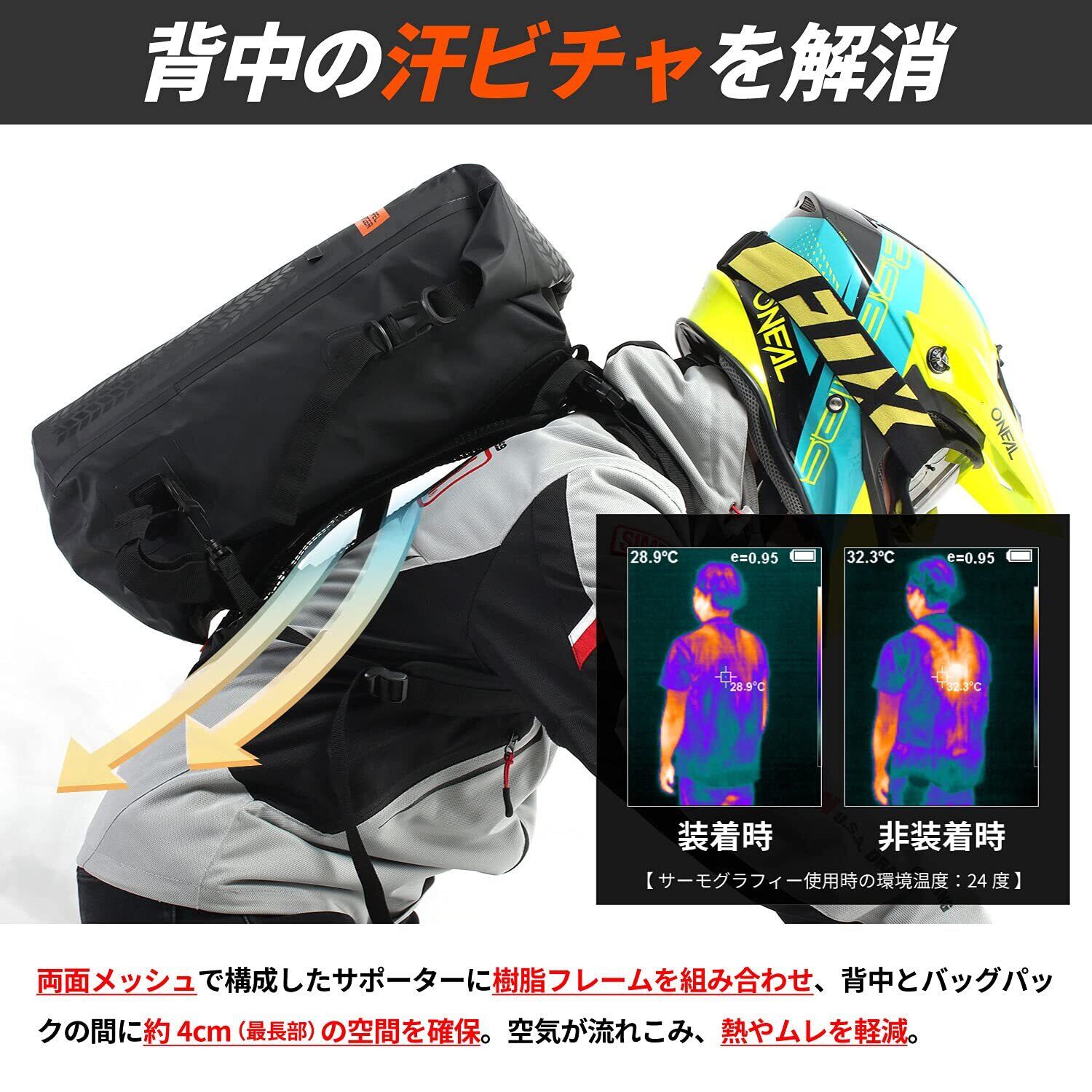 両面メッシュで構成したサポーターに樹脂フレームを組み込むことで、背中とバッグパックの間に最大約4cmのリフトを確保。