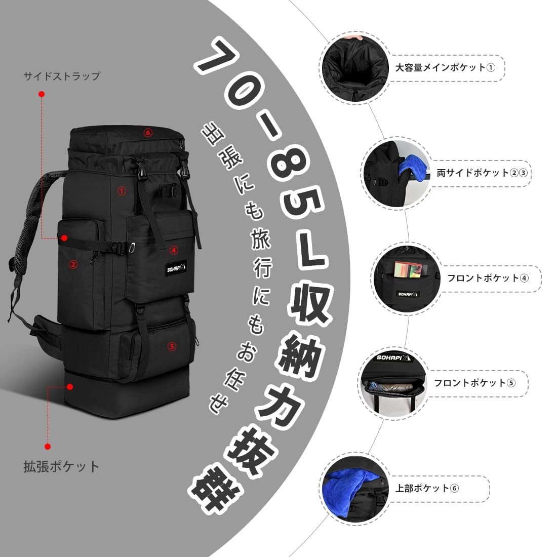 [SOHAPI] 登山リュック 70-85L 大容量 超軽量1.28kg 防災・耐水 通気性バックパック 3Dメッシュ背当て 6ポケット収納 耐撕裂ナイロン 男女兼用 防災 キャンプ/旅行/ハイキング用 3-4日間アウトドア対応