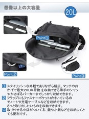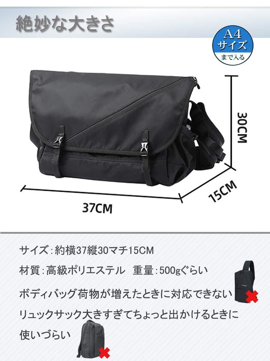 サイズ:横37*縦30*マチ15CM絶妙な大きさでA4サイズ資料、教科書スマホ、14インチパソコン、9.7インチiPad、カギ、手帳、500MLボトル、折りたたみ傘、お弁当箱、長財布、1日~2日旅行の軽い荷物など普段使いに必要な持ち物が入れる大容量のショルダーバッグです。マチ幅がしっかりあるので、収納力は抜群。通勤、通学だけでなく、ちょっとした外出や旅先などで大活躍のボディバックは、メインポケット以外にも小分けポケットを用意しています。ポケットが多いので小物整理が得意なのがうれしいポイントです。