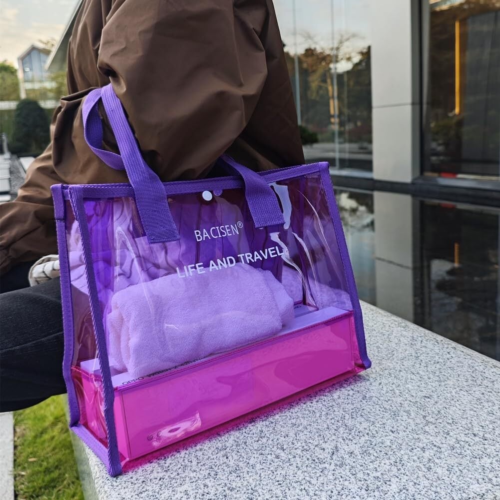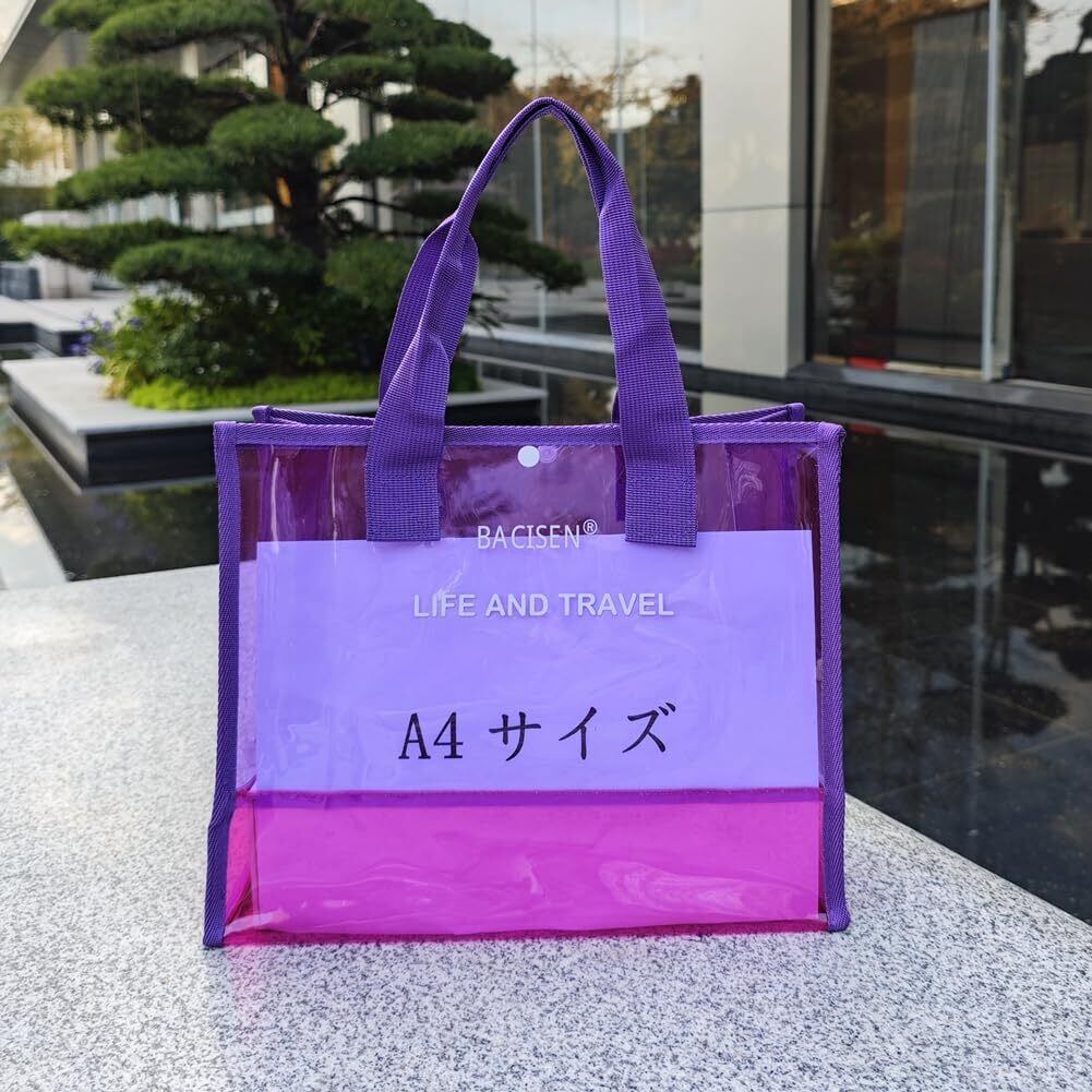 【濡れても大丈夫な透明バッグ】耐水性PVC素材を採用した上、精密な縫製テクニックを利用して、しっかりとした生地です。雨の日にもバッグの中身を湿すことは心配いらないです。上部スナップボタン付で簡単に留められるから中身が飛び出さなくて安心です。また、透明のデザインなので、バッグの中身がひと目で確認できます。通学、プール、キャンプ、お花見、ジム、運動会、温泉用のバッグなどとしても活躍します。