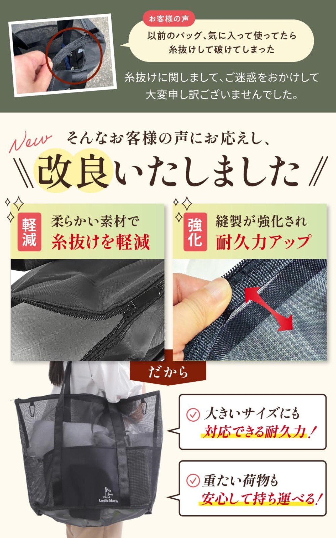 【目隠し外ポケット設計】プライバシーを守れる外ポケット付き。外から中の荷物が見えづらくなっているので、安心して貴重品や小物を収納できます。【濡れたものを入れられるメッシュ素材】水濡れに強く、通気性の良いメッシュ素材を採用。濡れたタオルや水着もしっかり収納でき、乾きも早いのでカビや匂いを防ぎます。