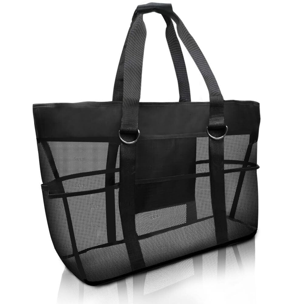 CANPEKI ビーチバッグ プールバッグ 軽量 大容量 メッシュバッグ ビーチ/水泳/ジム/スパ/温泉/旅行 収納袋 手提げカバン 収納力 折り畳み可能 手提げバッグ (ブラック)