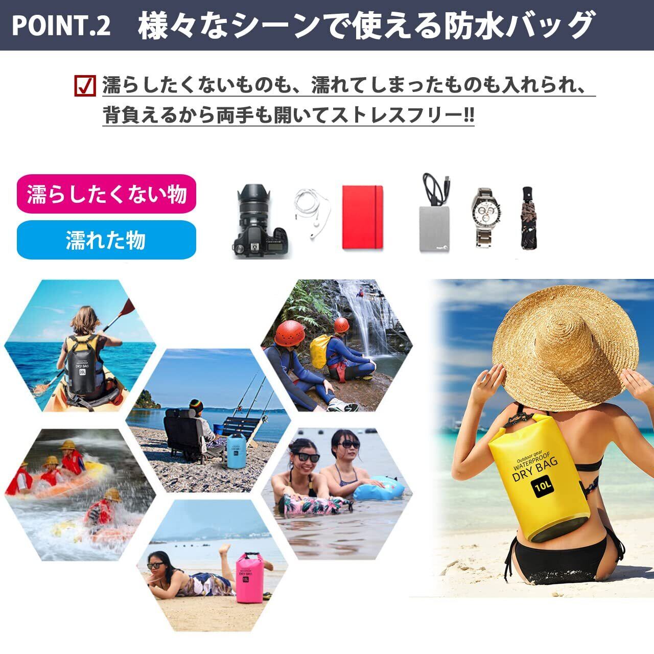 本商品は耐久性と防水性を高めるためにダブルステッチの再成形シール付きシーム加工を実施。さらにロールトップ・プラスチック・クロージャーシステムにより入り口からの浸水に対して安全性と防水性を確保。プラスチック・クロージャーとショルダーストラップの留め具は軽量性と頑健化を実現。高密度ナイロン製で調節可能なショルダーストラップは簡単に長さ調整が可能であなたの体にジャストフィットします。5Lと10Lタイプにはワンショルダーストラップが、20L、30Lにはデュアルショルダーストラップが付属。ワンショルダーで斜め掛け、ダブルショルダーでバックパックスタイルの2wayでの利用が可能。