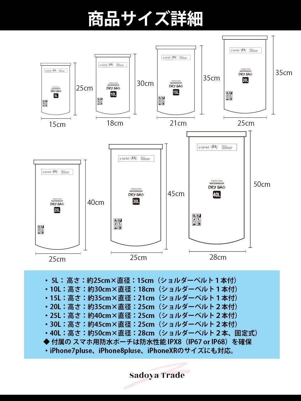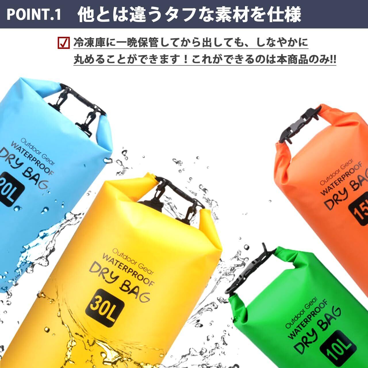 1【日本テレビ Zip!で紹介されたIPX6レベルの防水バッグ・ネームタグ付き】【自衛隊から注文される長持ちするドライバッグです】【 冬でも柔らかな素材 】【スマホポーチ付きサービスは終了しました(一部のカラー×サイズで付属する場合があります)】夏でも冬でも、海でも山でも、一年中タフに使えるしなやか防水バッグ・ドライバッグです。0.5mmの厚みの第4世代素材「Ultra-Soft Coating 500D PVC Tarpaulin」を採用。 耐久性と防水性を高めるためにダブルステッチ再成形シール付きシーム加工ですき間からの水の侵入を完全に阻止。耐久性と柔軟性を兼ね備えた商品。 ー30℃~70℃までしなやかさを確保。 耐久年数2年間という堅牢さを実現。 ヘビーデューティに防水バッグをお使い頂きたい方には最適な商品です。 本商品は、雨、雪、ほこり、砂に対してお客様の荷物を安全にドライに保ちます。【サイズ豊富】5L、10L、15L、20L、25L、30L、35L、40L _ _