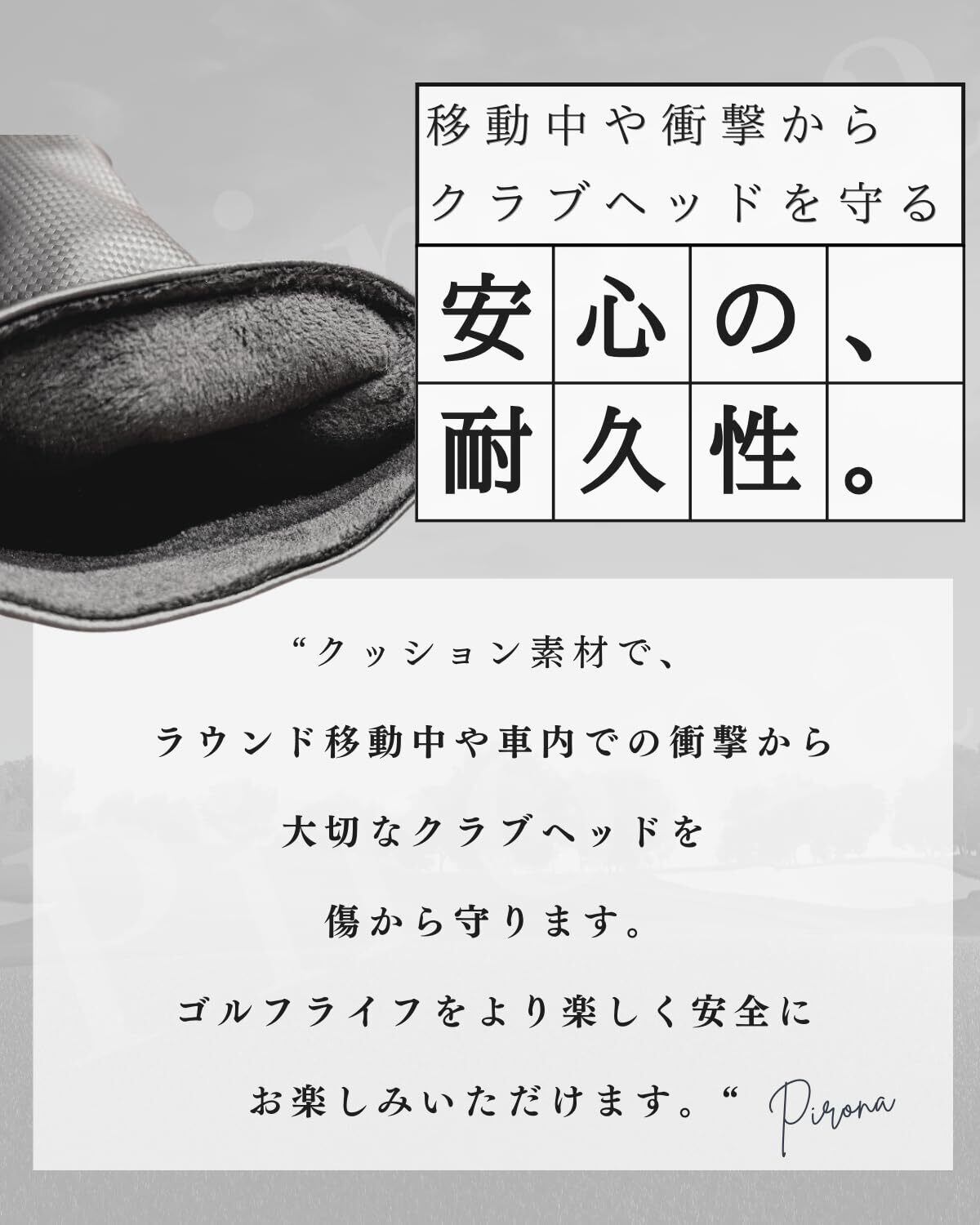 【品質・安心の日本ブランド】 Pironaは、日本のゴルフクラブヘッドカバー専門ブランドです。 初期不良や故障などの場合は、迅速かつ丁寧に対応させていただきます。またご購入から30日間は付きです。ヘッドカバーは初期不良などあれば全額返金で致します。