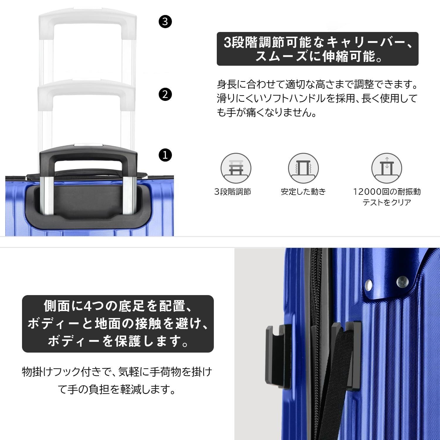 【静音キャスター&調節可能なキャリーバー】キャリーケースは三段階調節なアルミ合金制キャリーバーを採用し、スムーズに伸縮可能。TPE素材で作られた静音キャスターが走行中の振動を軽減し、高耐摩耗性、静音性を実現しながら、360°自由に回転可能。後ろの2個のキャスターにストッパー付き、傾斜のある地面でも簡単にキャスターの動きを止められ、移動中のストレスを軽減。