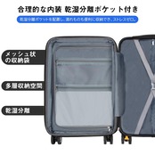 【合理的な内装&乾湿分離ポケット】合理的な内装デザインで乾湿分離ポケットも追加され、濡れものの収納に大変便利。メッシュポケット付きで小物などのお荷物が分かりやすく、一目瞭然。U型仕切り、クロスベルトまで完備され、荷物崩れを完全防止。