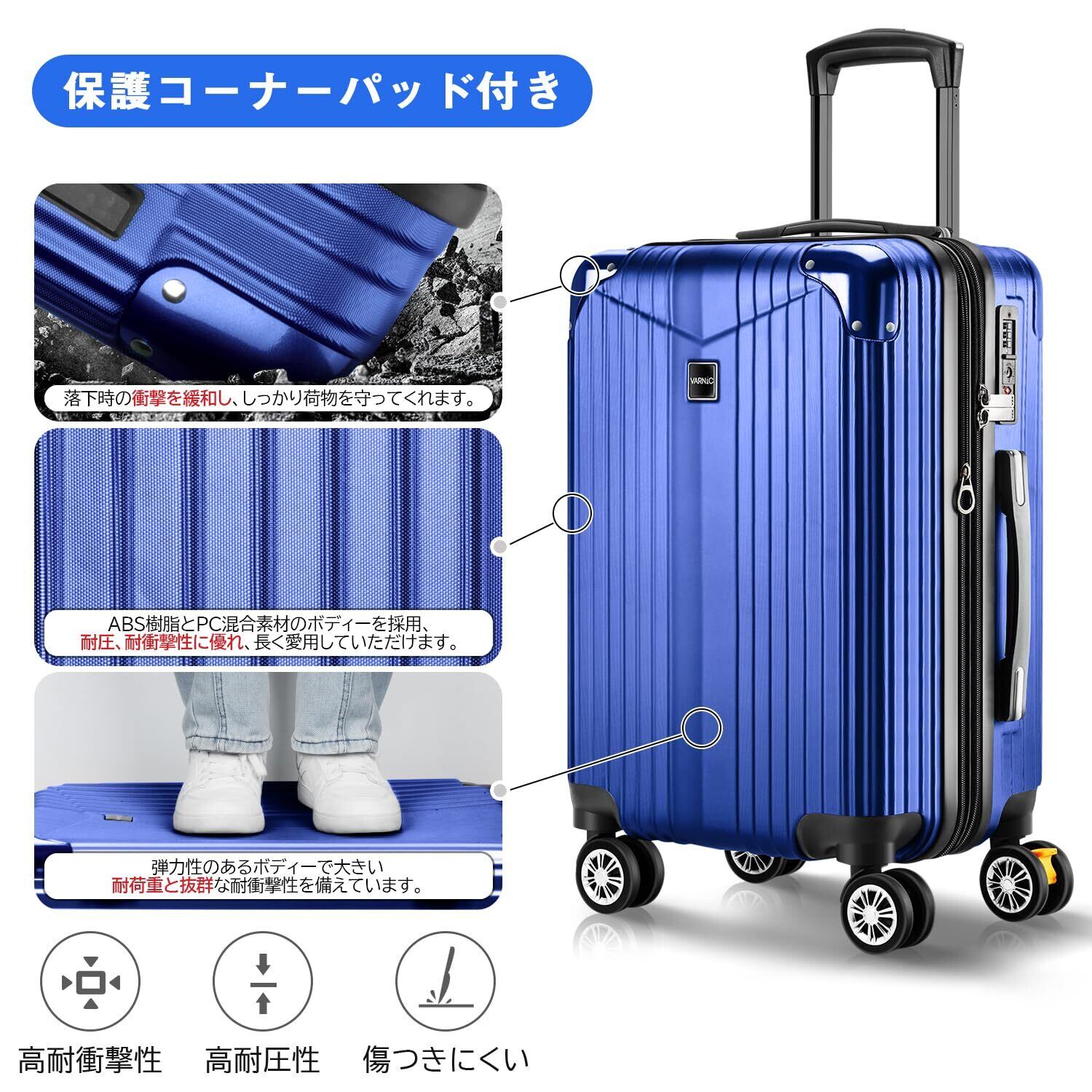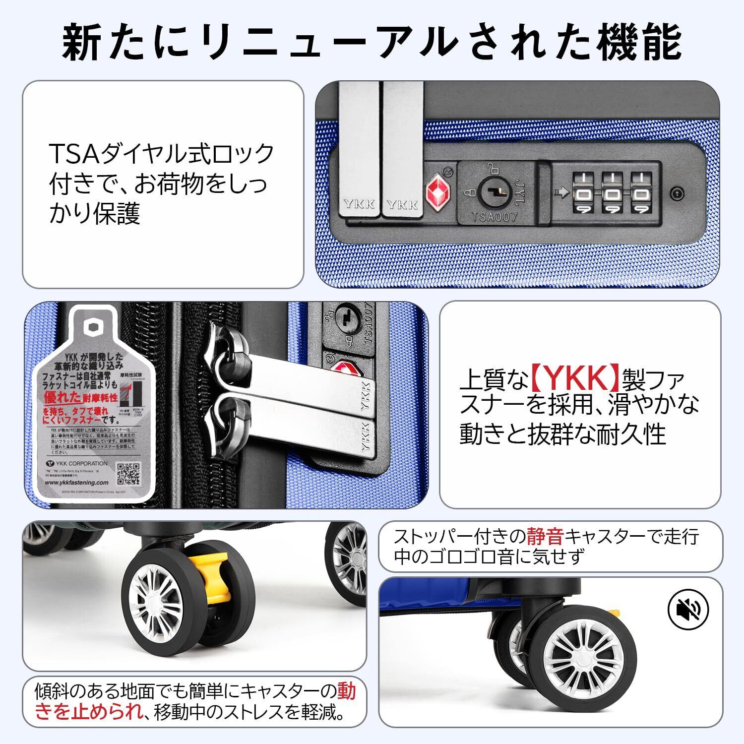 [VARNIC] スーツケース キャリーケース キャリーバッグ 【YKK】 製ファスナー 拡張機能 ストッパー付きキャスター TSAダイヤル式ロック 振動軽減 軽量 大容量 静音 乾湿分離ポケットつき スーツケースベルト付き 物掛けフック式底足 ファスナータイプ 旅行 ビジネス 出張 学生用キャリーケース (ブルー, S)