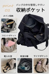 【軽量で機能的な素材】 軽量なナイロン生地を使用し、カバン内の荷物をしっかり守ります。内部には濡れたものを収納できる防水ポケットがあり、側面には靴を収納できるポケット、反対側には調節可能なサイドポケットを備えています。また、背面には行李箱に掛けられる機能があり、さらに便利なファスナーポケットも付いています。