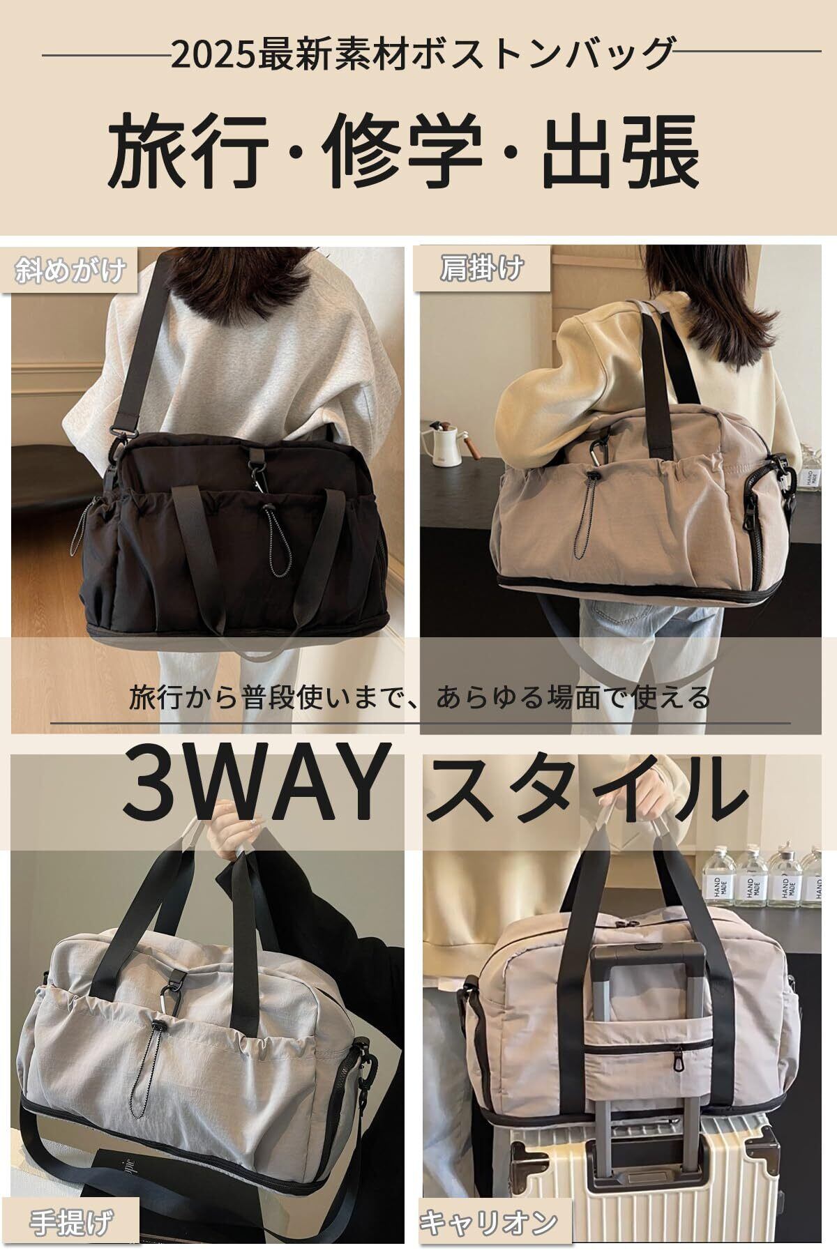 【多彩なシーンで活躍】 旅行はもちろん、トラブルや出張、ジム用のスポーツバッグ、修学旅行、マザーズバッグとしても最適です。撥水加工ナイロン素材なので、大切な品物を雨や汚れから守ります。