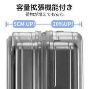 【拡張機能付き/PC+ABSハイブリッド 頑丈なボディ】軽量で耐衝撃性に優れた人気のPCとABS樹脂素材のハイブリッドボディは、3層構造で丈夫で耐久性があります。エンボス加工により傷が目立ちにくく、長期間美しい外観を保ちます。また、ボディの中央に拡張するためのファスナーがあり、開くと約4センチ広がります。拡張時でもシェルが分離せず、スーツケースボディがゆがみにくくなっています。※エキスパンダブル機能未使用時のみ無料預入受託サイズ(3辺合計158cm未満)