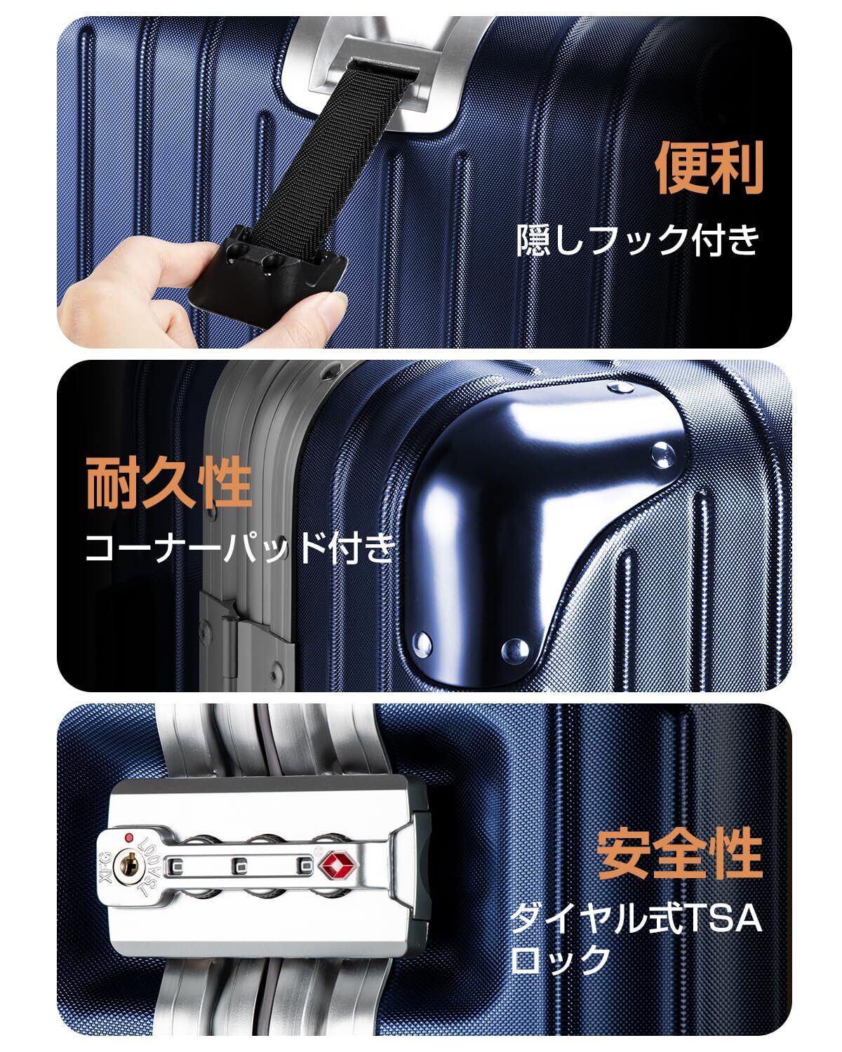 【改良されたアルミフレーム&ボディー素材】スーツケースは強化アルミフレームを採用し、従来のファスナータイプに比べ、高級感があって頑丈です。また、スーツケース本体の形状維持を強化させ、耐衝撃性と耐久性を向上させます。ボディーはABS樹脂とPCの混合素材で作られ、耐衝撃性に優れています。エンボス加工を施し、傷つきにくいです。