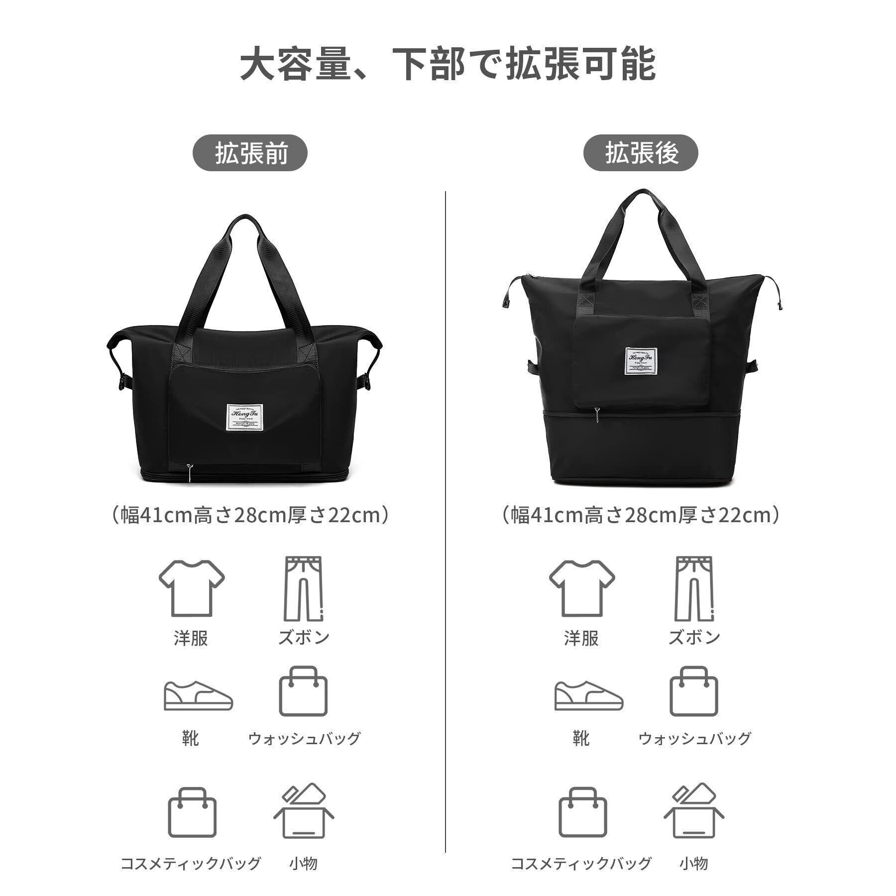 【折りたたみ式】折りたたみサイズ:長さ28cm、幅4cm、高さ18cmで、持ち運びに便利で収納スペースもありません。 【乾湿分離】トラベルバッグには、トイレタリーやウェットタオルを収納できる乾湿分離バッグが入っています。 【防水生地】耐摩耗性、撥水性を備えた高密度オックスフォード生地。 【底部拡張可能】底部はジッパーで拡張機能を隠し、底部は10cm拡張可能で、必要に応じて容量を調整できます。 【広く使われているスポーツバッグ】私たちのスポーツジムバッグは、屋内と屋外の両方のスポーツに最適な信頼できるコンパニオンです。トレーニング、旅行、スポーツ活動、テニス、バスケットボール、ヨガ、釣り、キャンプ、ハイキング、多くの野外活動。ジムスポーツバッグ、スクールダッフルバッグ、トラベルダッフルバッグ、トラベルホールドオールバッグ、ジムホールドオールなどに適しています。