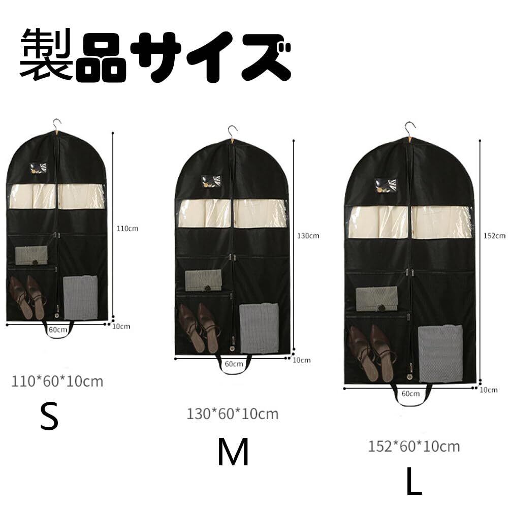 【商品仕様】サイズ:S:110*60*10cm、M:130*60*10cm、L:152*60*10cm、サイズは3種類あり、用途に合わせて購入できます。明に見える立体的な衣装バッグは、ほこり、湿気、虫を防ぐことができ、通常のクリーニングやメンテナンスは、濡れたタオルで拭くか、直接洗浄するために使用することができ、再利用することができます。